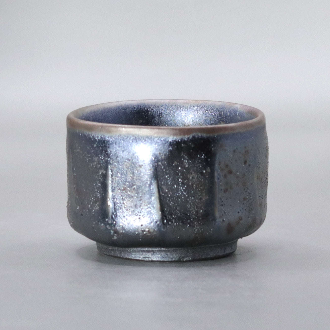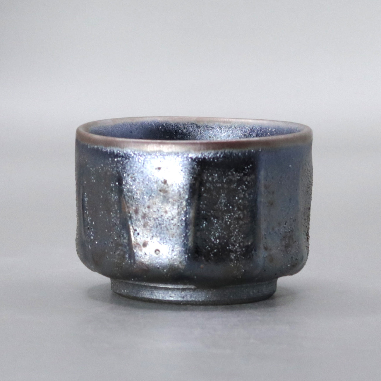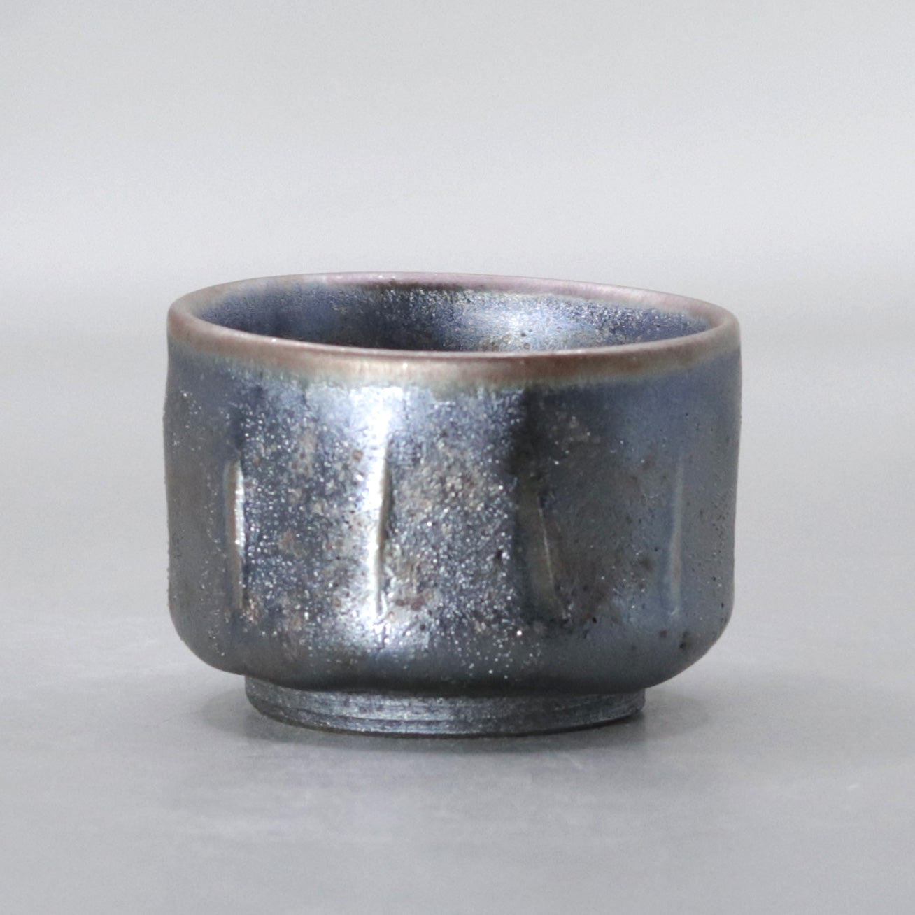 本作は、京都・宇治炭山に窯を構える岡田優様が手掛けられた天目釉酒盃です。比較的低めの筒形を基調に、胴部下端に施された鎬(しのぎ)が静寂な闇にリズムを刻みます。藍鋼色(らんこうしょく)の黒釉には微細な鉄結晶が銀砂のように散り、光の当たり具合で青紫や鈍金(にびがね)の光彩が揺らめき、夜空の星雲を想起させる景観が広がっています。口縁部はうっすらと緋色(ひいろ)を帯び、冷たい宇宙の中にわずかな温もりを宿しています。