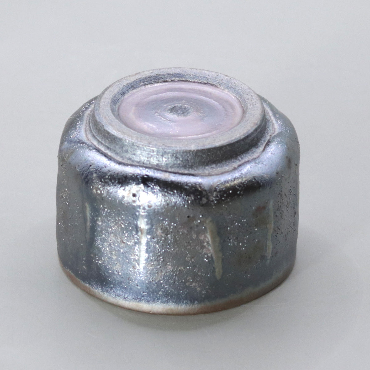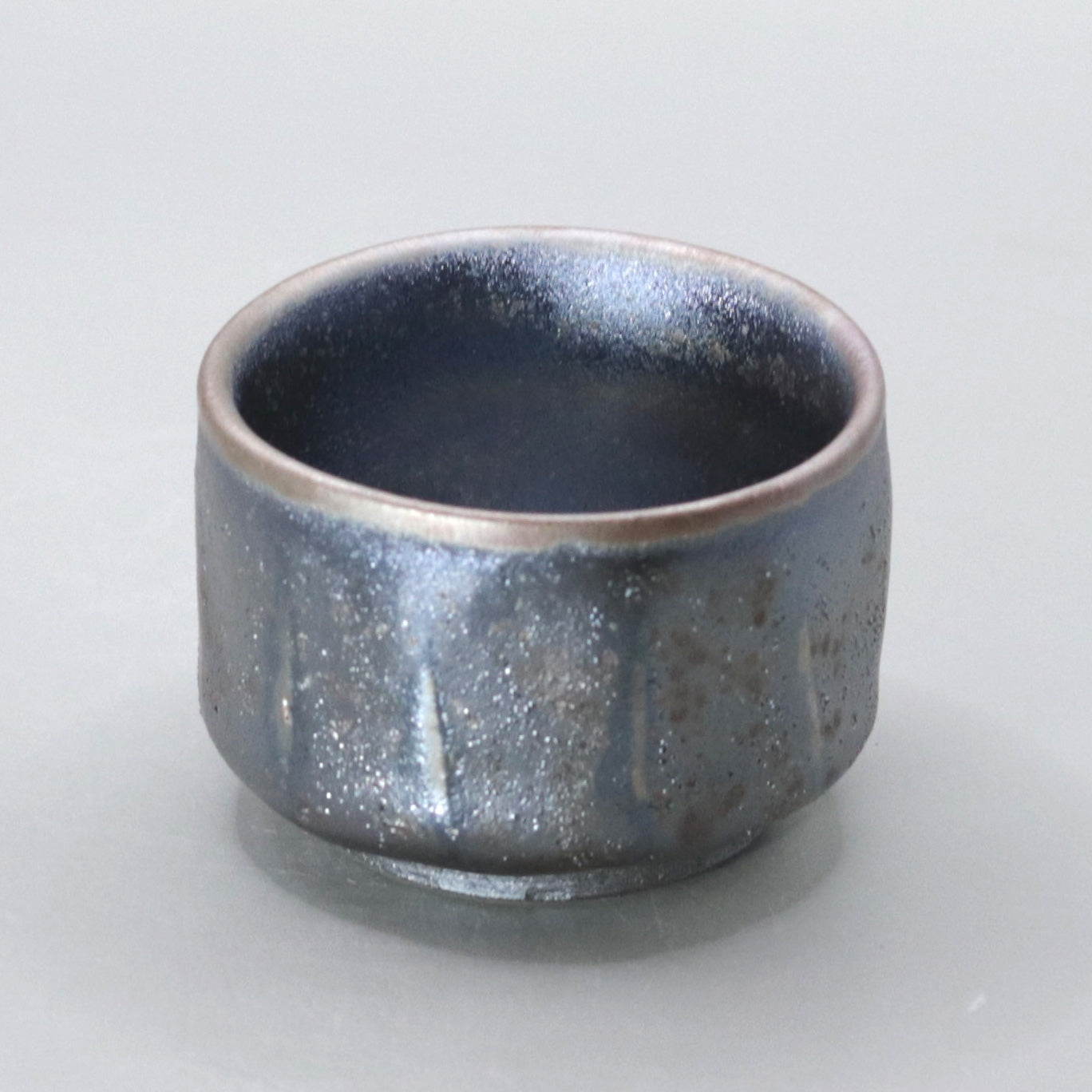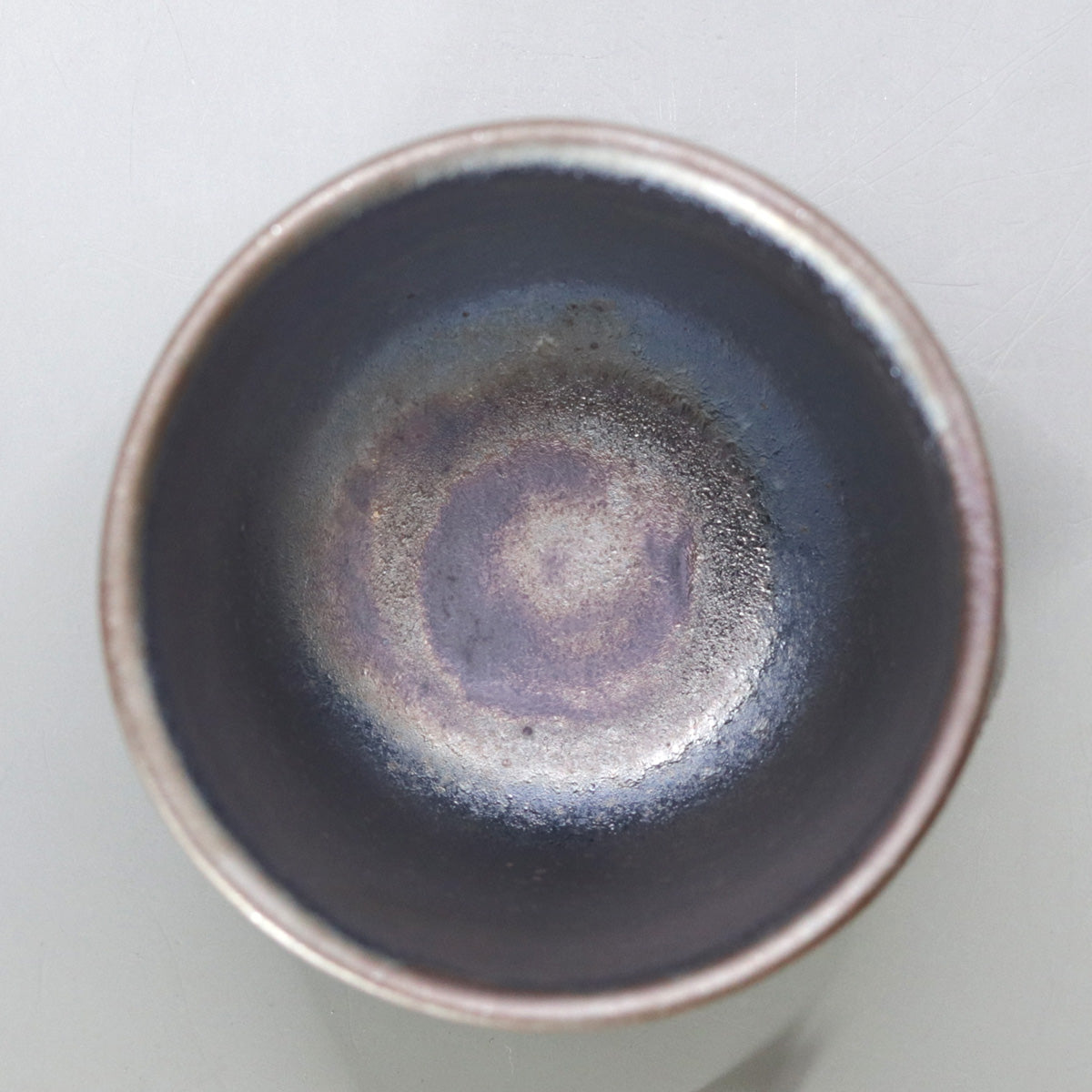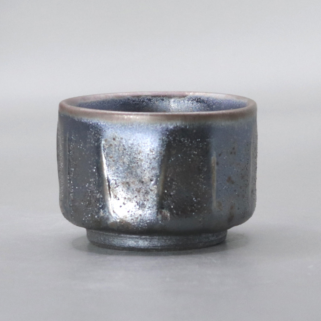 本作は、京都・宇治炭山に窯を構える岡田優様が手掛けられた天目釉酒盃です。比較的低めの筒形を基調に、胴部下端に施された鎬(しのぎ)が静寂な闇にリズムを刻みます。藍鋼色(らんこうしょく)の黒釉には微細な鉄結晶が銀砂のように散り、光の当たり具合で青紫や鈍金(にびがね)の光彩が揺らめき、夜空の星雲を想起させる景観が広がっています。口縁部はうっすらと緋色(ひいろ)を帯び、冷たい宇宙の中にわずかな温もりを宿しています。