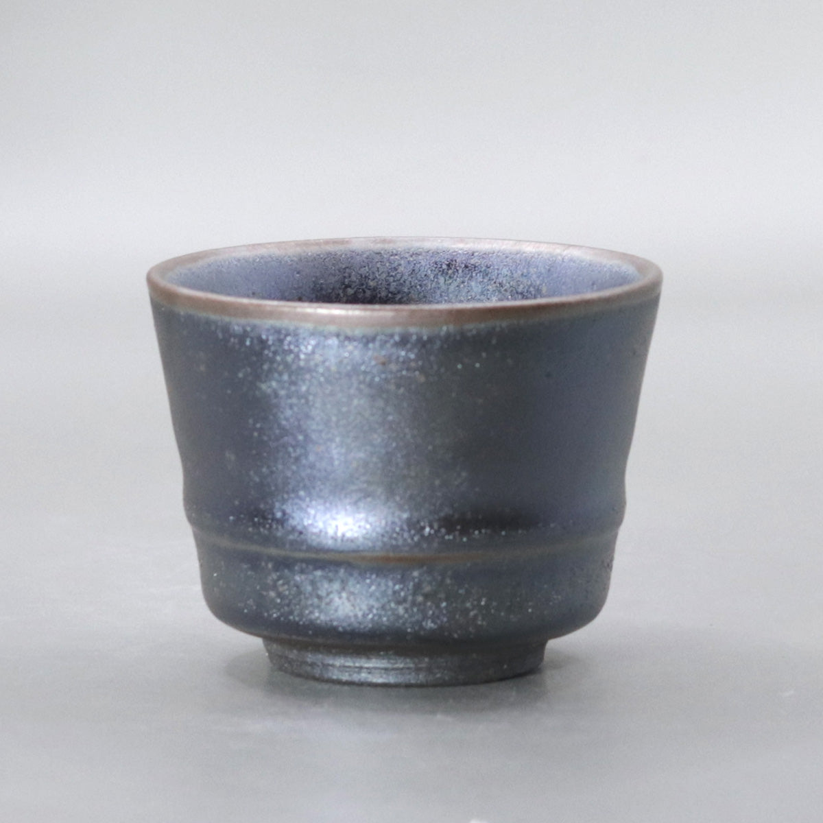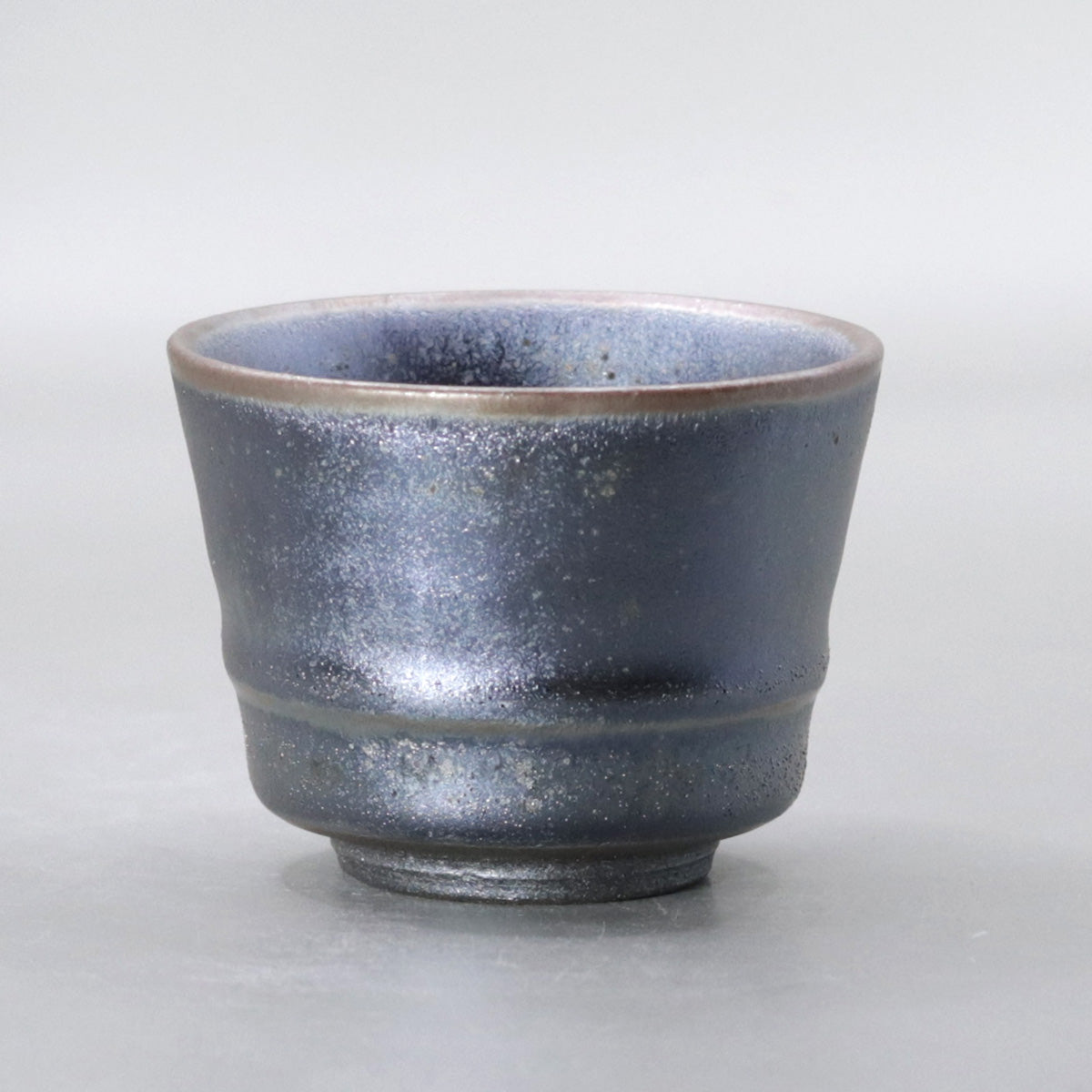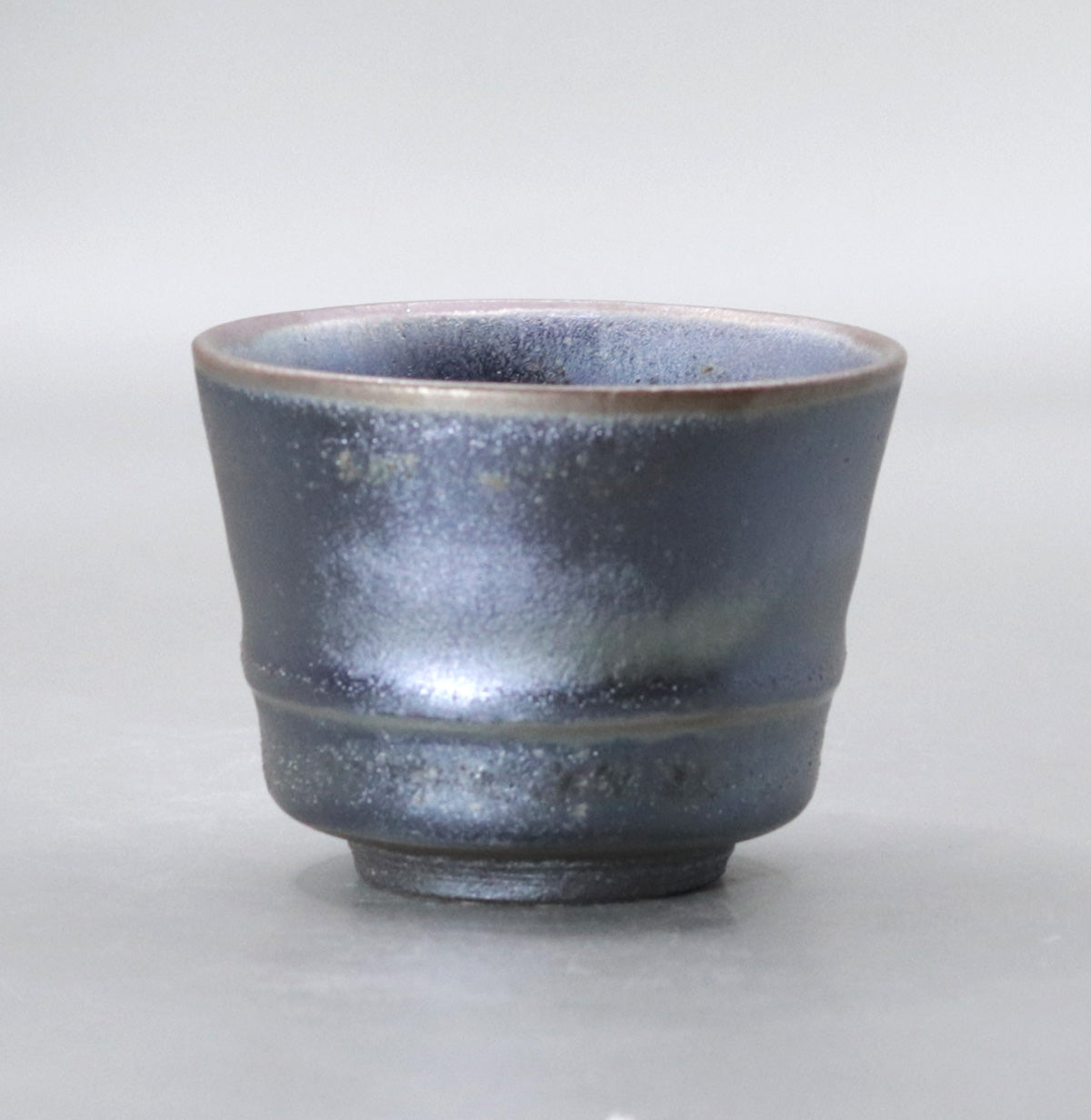 本作は、京都・宇治炭山に窯を構え、黒釉と窯変表現の研究で名高い岡田優様が手掛けられた天目釉酒盃です。ストレートな円筒形を基調にしながら、腰部でわずかに括れを設け、下部へ向かって穏やかに膨らむフォルムが特徴的です。渋い藍鋼色(らんこうしょく)の天目釉に無数の微細な油滴結晶が散り、静かな夜空を思わせる深みと輝きを宿しています。口縁には緋襷(ひだすき)のような紫褐色が滲み、黒釉の闇に温かな余韻を添えています。