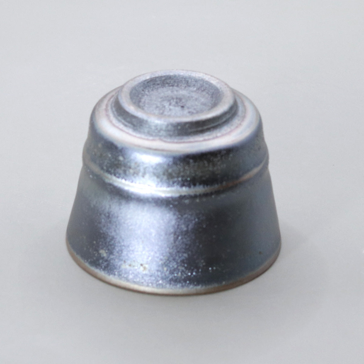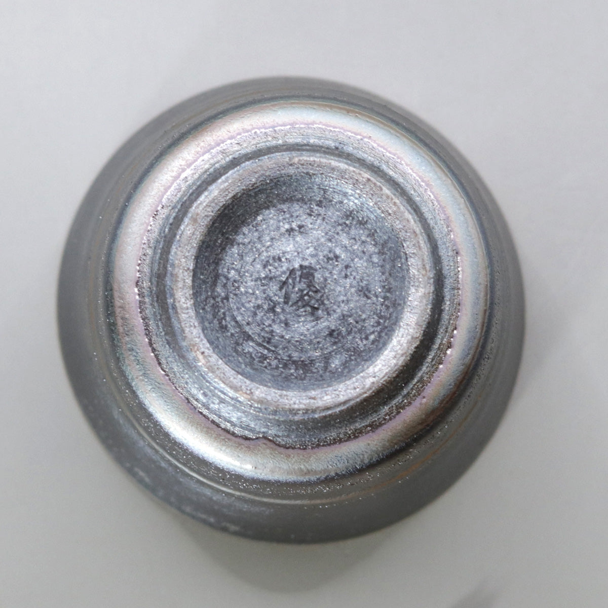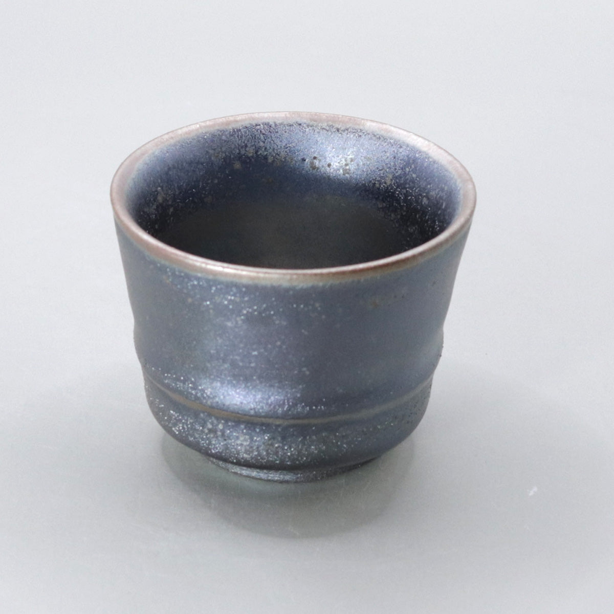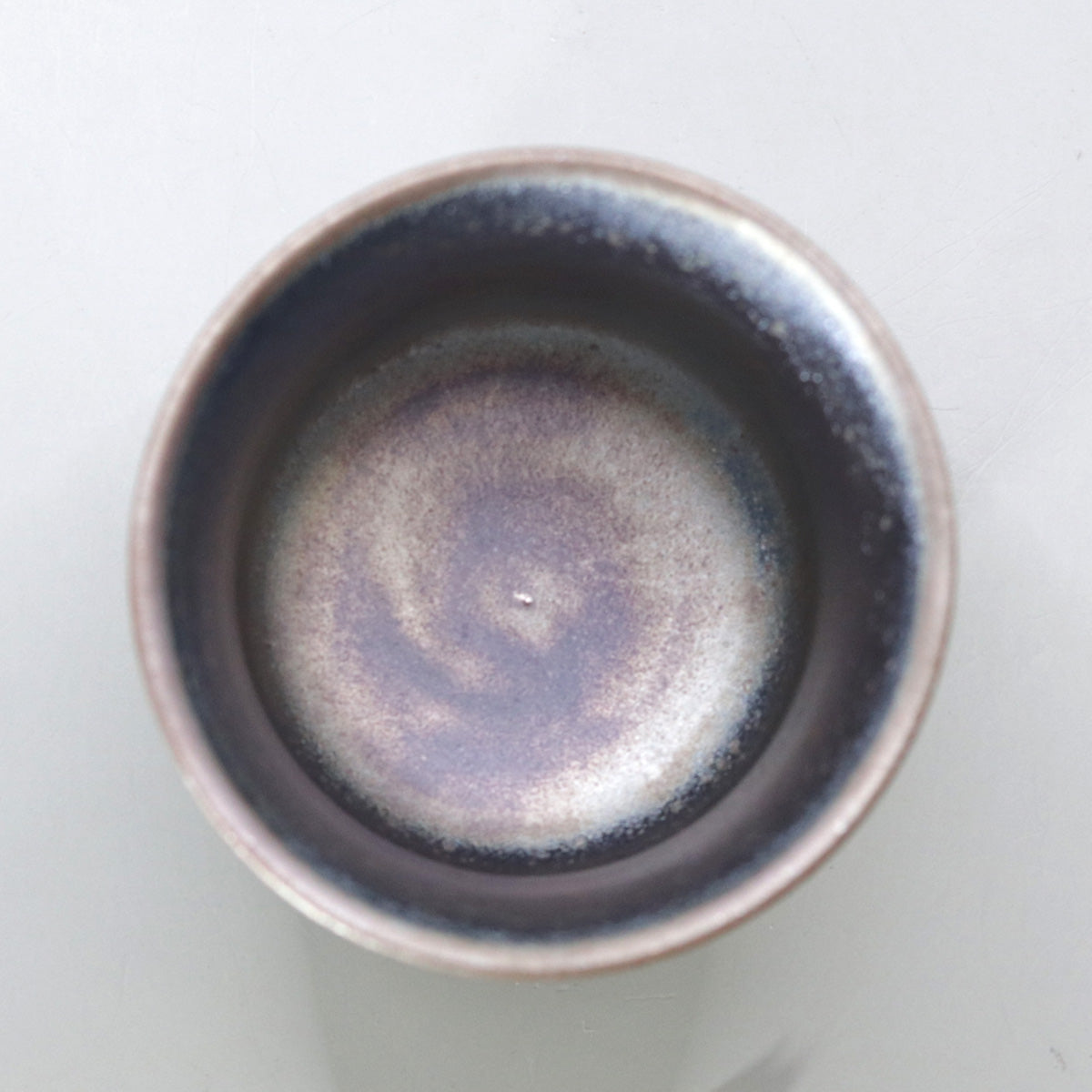 本作は、京都・宇治炭山に窯を構え、黒釉と窯変表現の研究で名高い岡田優様が手掛けられた天目釉酒盃です。ストレートな円筒形を基調にしながら、腰部でわずかに括れを設け、下部へ向かって穏やかに膨らむフォルムが特徴的です。渋い藍鋼色(らんこうしょく)の天目釉に無数の微細な油滴結晶が散り、静かな夜空を思わせる深みと輝きを宿しています。口縁には緋襷(ひだすき)のような紫褐色が滲み、黒釉の闇に温かな余韻を添えています。