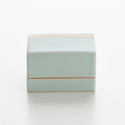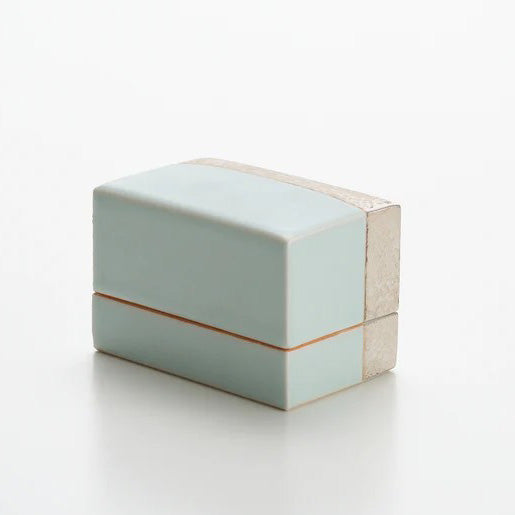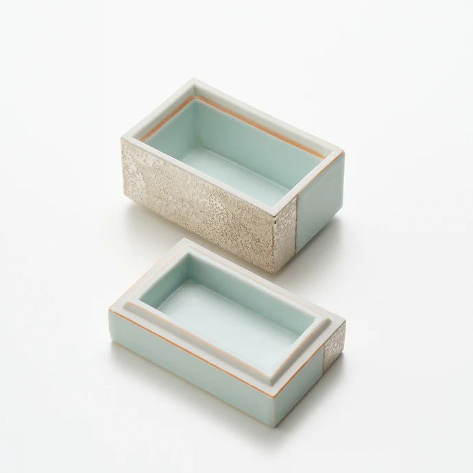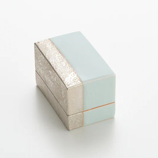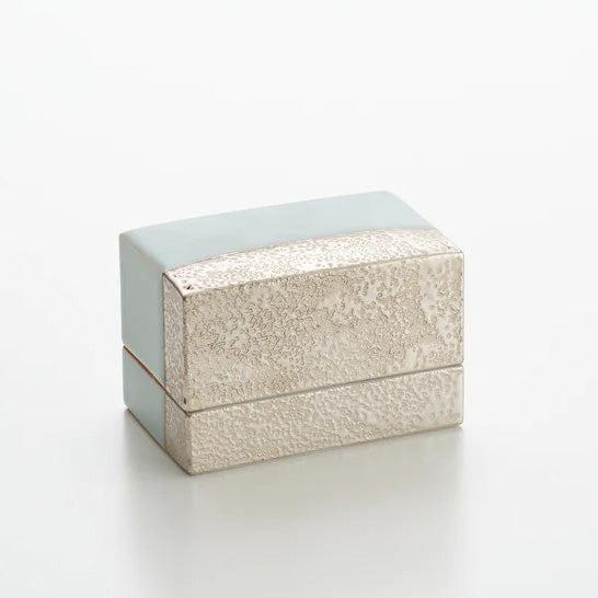 青白磁銀彩陶筥は、青白磁の淡い静水と、銀彩の岩肌のような質感を対比させた、静謐で建築的な陶筥です。閉じた姿では銀が場を澄ませ、開けば淡青の余白が現れ、収めるものの気配まで整えてくれる。