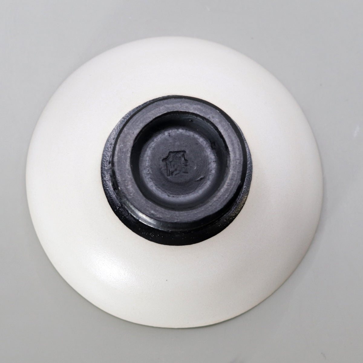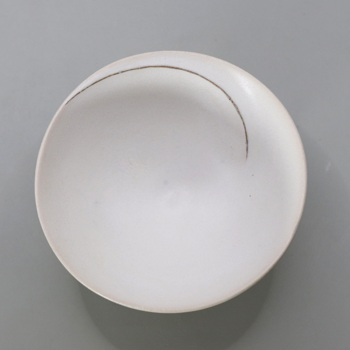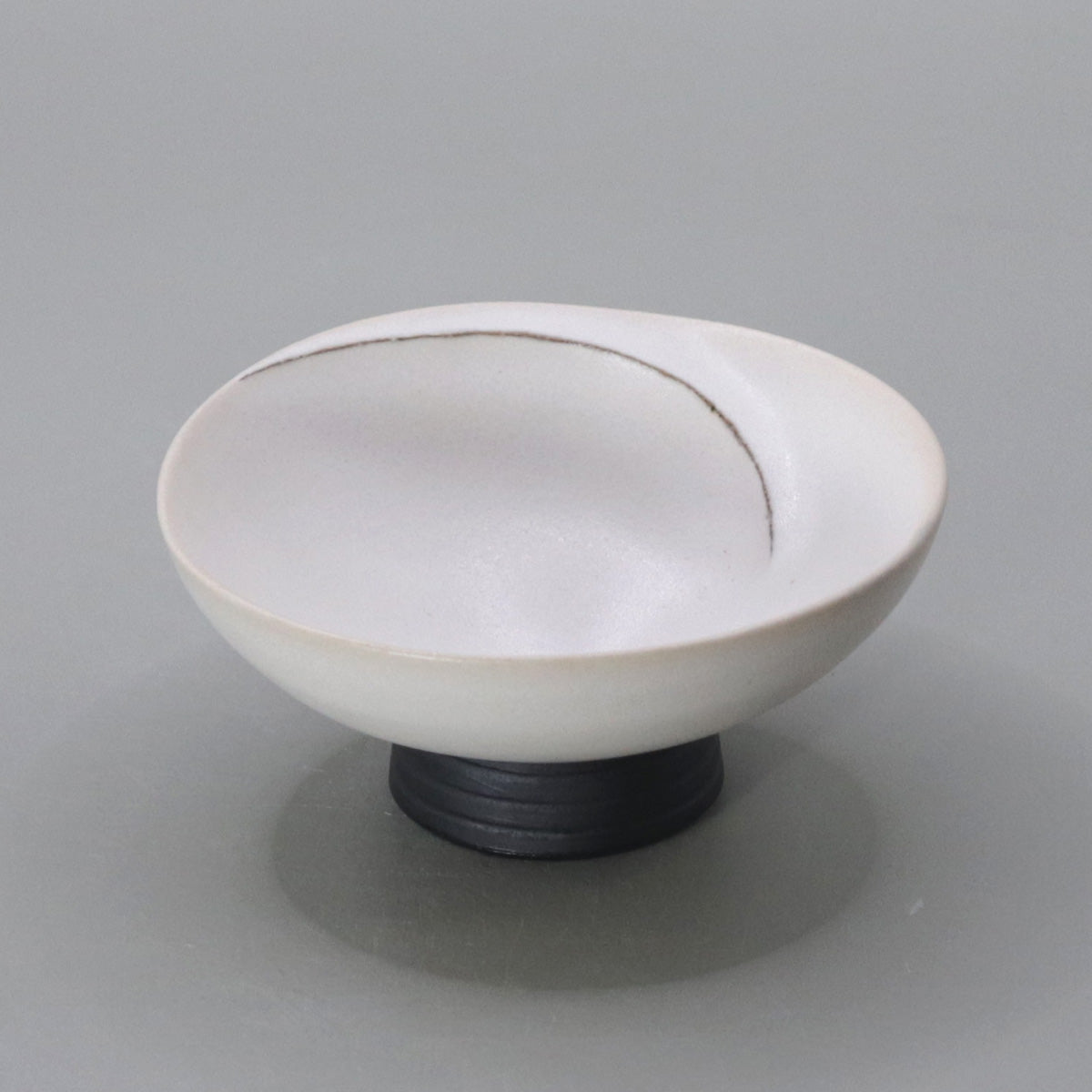 本作は、京都・宇治炭山で作陶を続ける岡田優様が手掛けられた白釉(しろゆう)の酒盃です。盃の内部を弧を描く稜線(りょうせん)が横切り、白磁の静謐さの中に一筋の緊張感を与えています。やや扁平に広がる鉢形と、高く黒く締まった円筒高台との対比が、抽象的なモダニズムを感じさせる意欲作です。