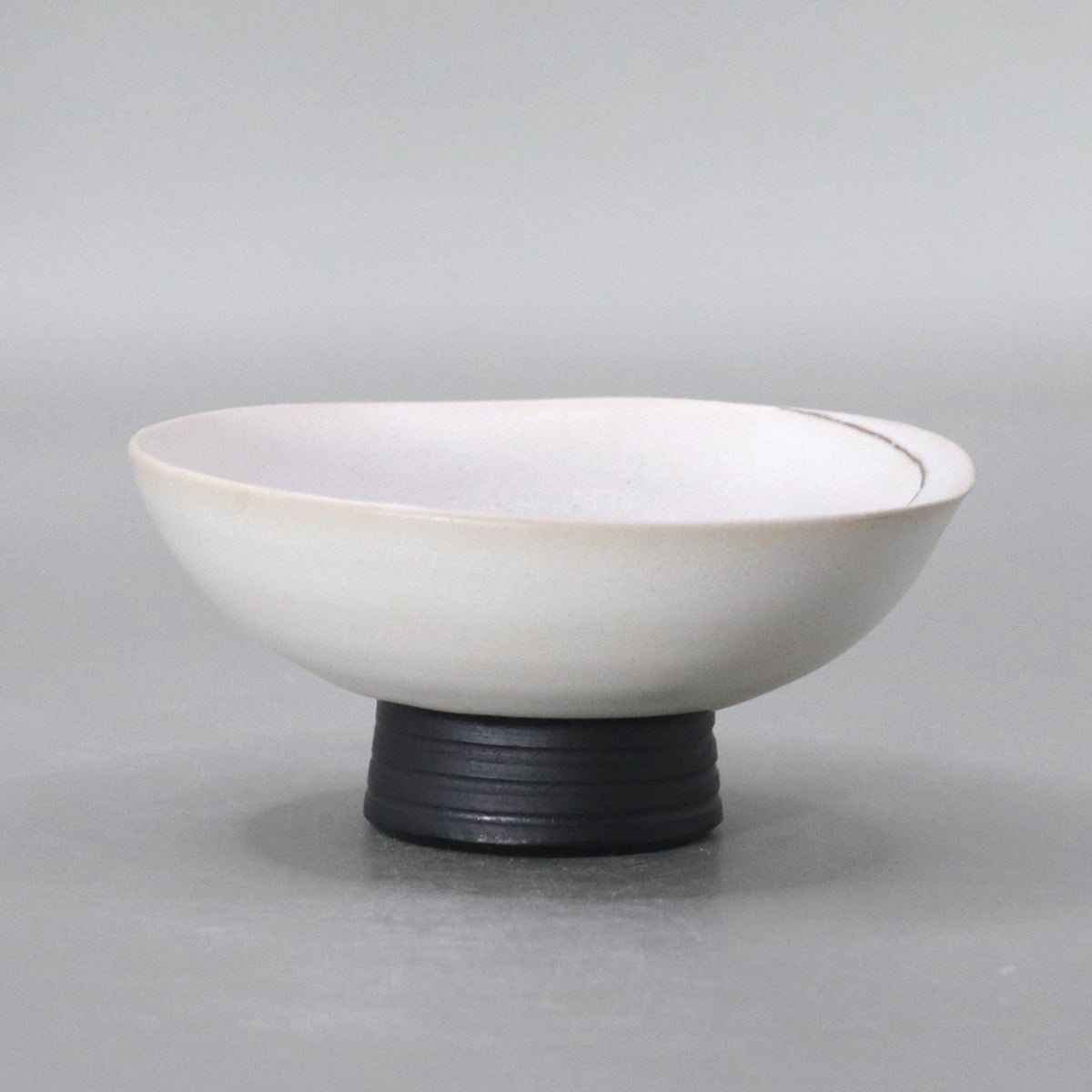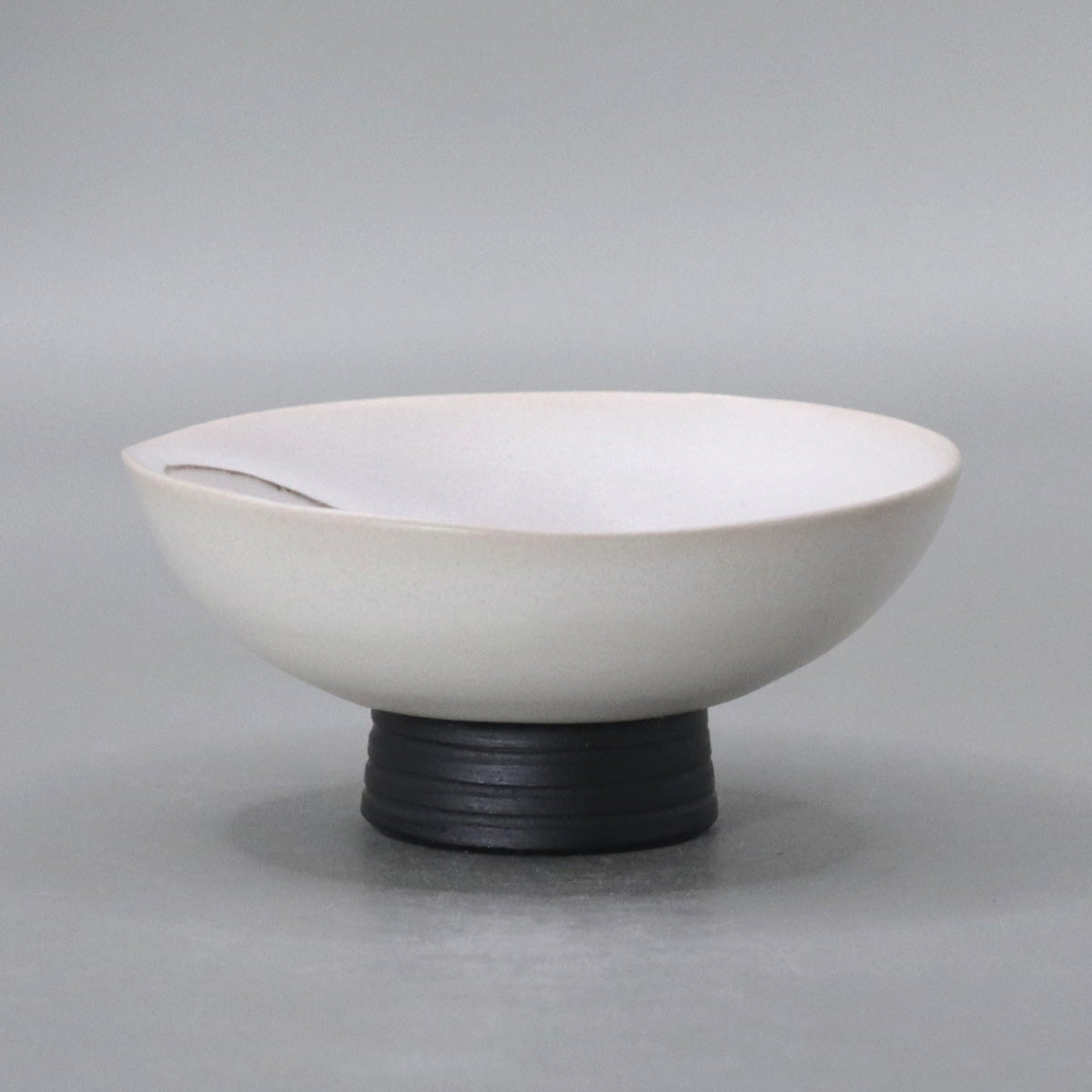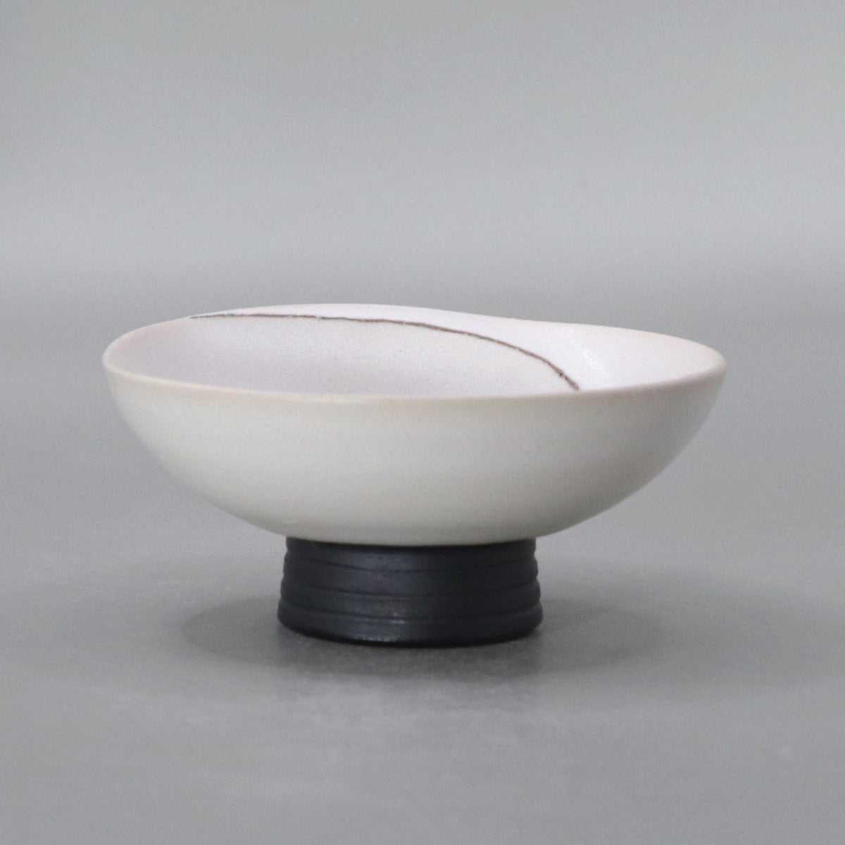 本作は、京都・宇治炭山で作陶を続ける岡田優様が手掛けられた白釉(しろゆう)の酒盃です。盃の内部を弧を描く稜線(りょうせん)が横切り、白磁の静謐さの中に一筋の緊張感を与えています。やや扁平に広がる鉢形と、高く黒く締まった円筒高台との対比が、抽象的なモダニズムを感じさせる意欲作です。