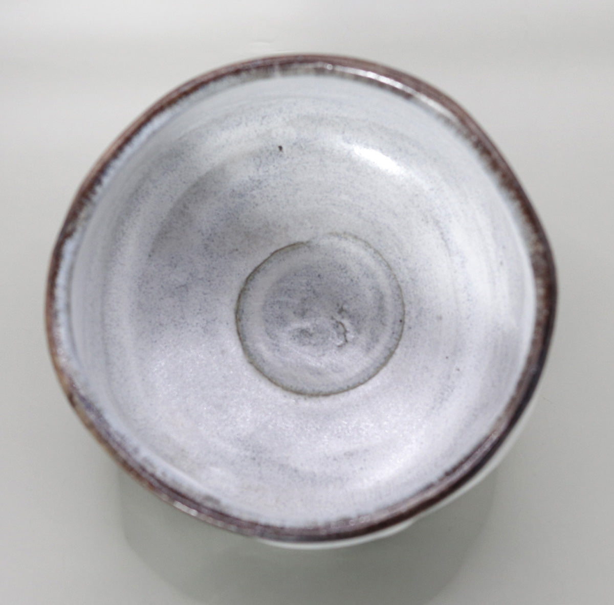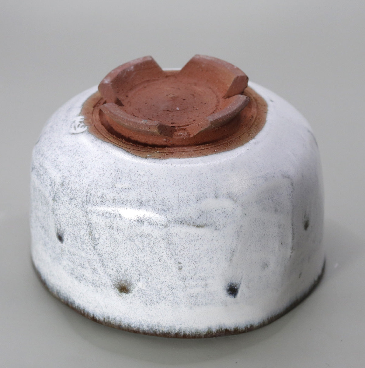 窯の炎が白釉の表面に淡い灰色の景色を描き、所々に現れる黒点が雪面に落ちた炭粒のような趣を添えています。口縁には灰が自然に降りかかり、ほのかな焦げ色が生まれました。炎と灰が重なり合う一度きりの景色は、時間の経過とともにさらに深みを増していきます。
