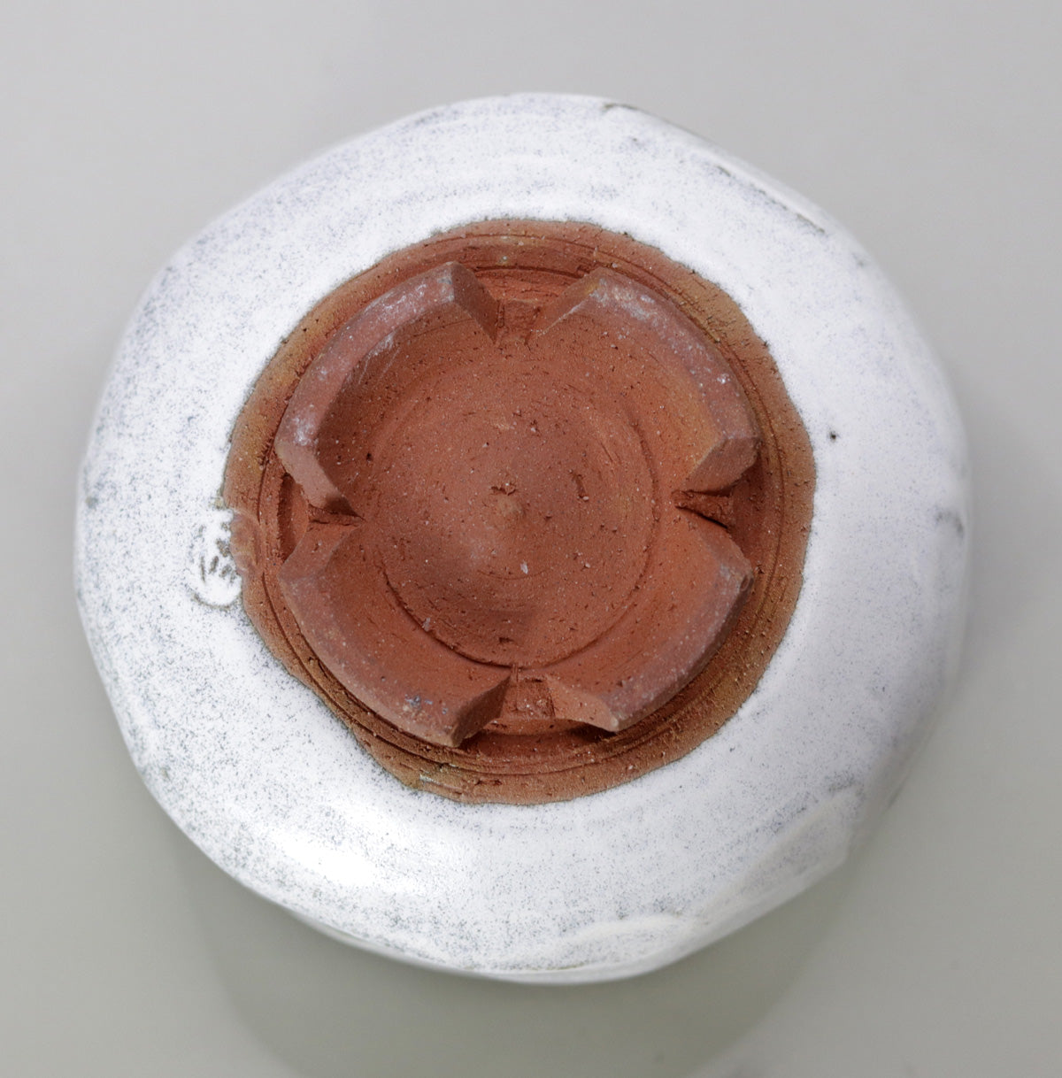 三日月形に切り込みを入れた高台からは赤土がのぞき、白雪の下から顔を出す土塊のような力強さを演出しています。