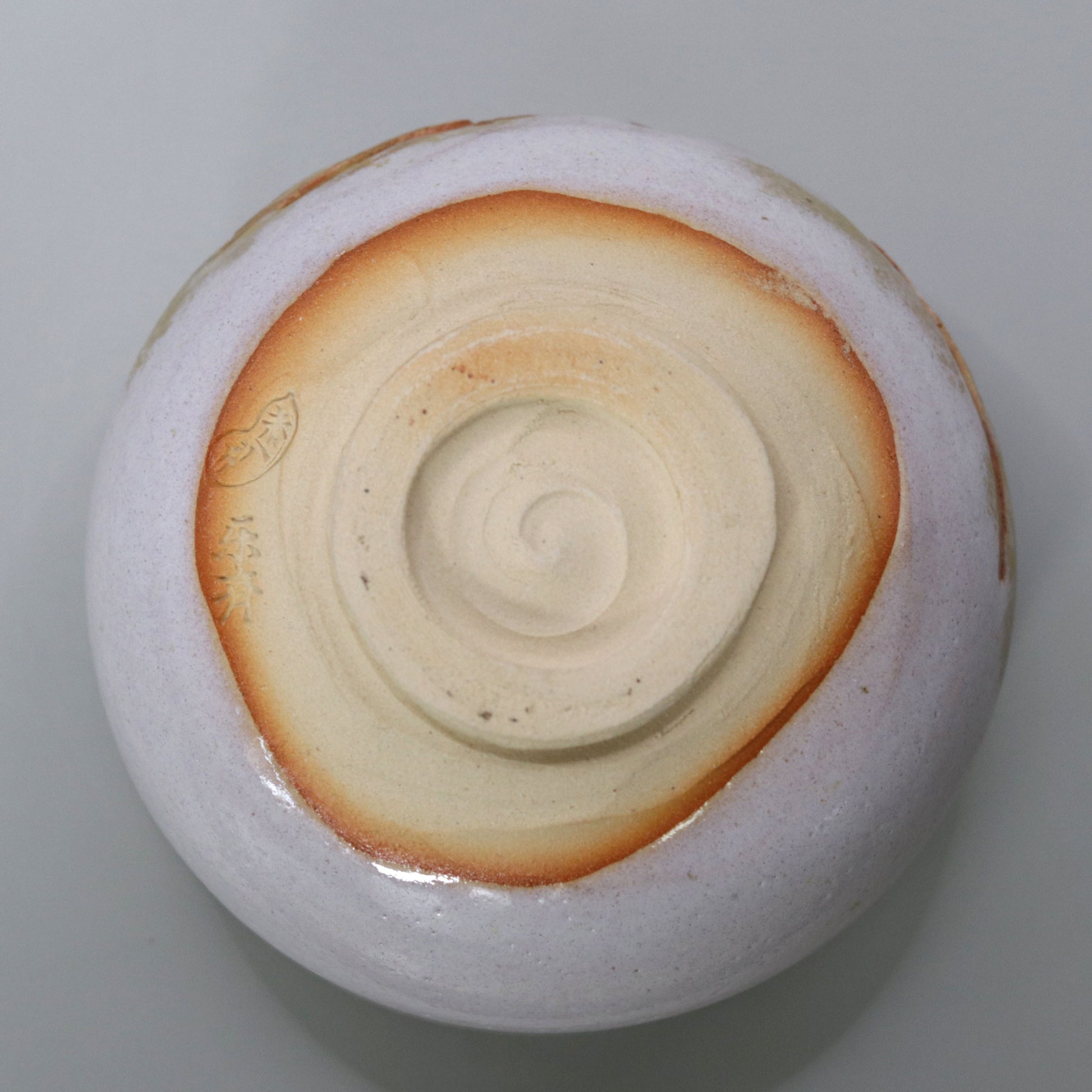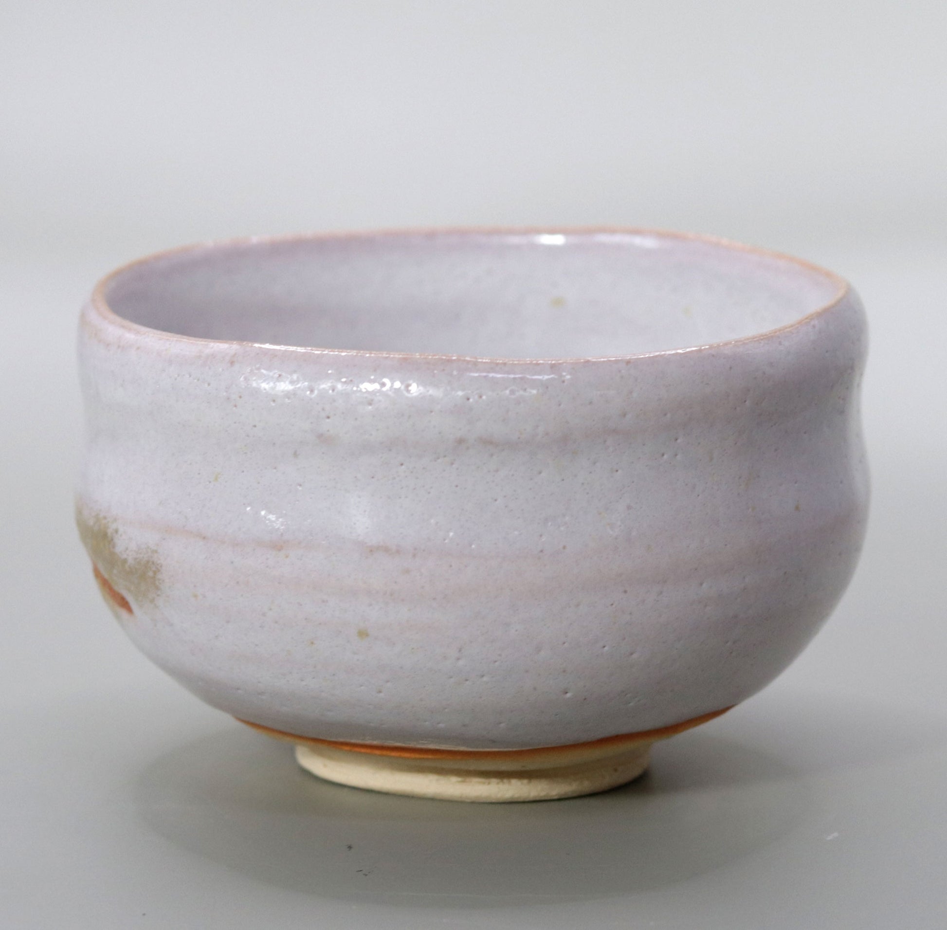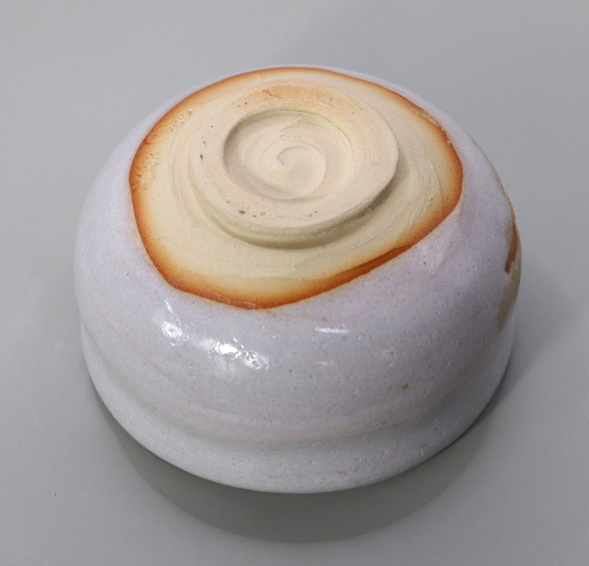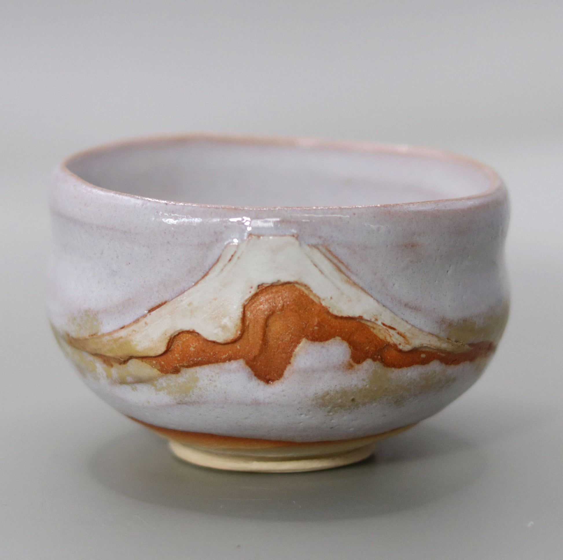 富士茶碗の特徴的な赤い模様は、釉薬が掛かっていない部分に見られるもので、土の色が白い茶碗に釉薬を施し、電気釜で酸化焼成することで生じます。この手法は、土の中に含まれる鉄分が焼成によって反応し、釉薬が掛かっていない部分で色が変わるという、非常に計算された技法です。朱色の模様は、当代の祖父が始めた手法であり、その伝統を受け継いだ技術が、この茶碗に息づいています。