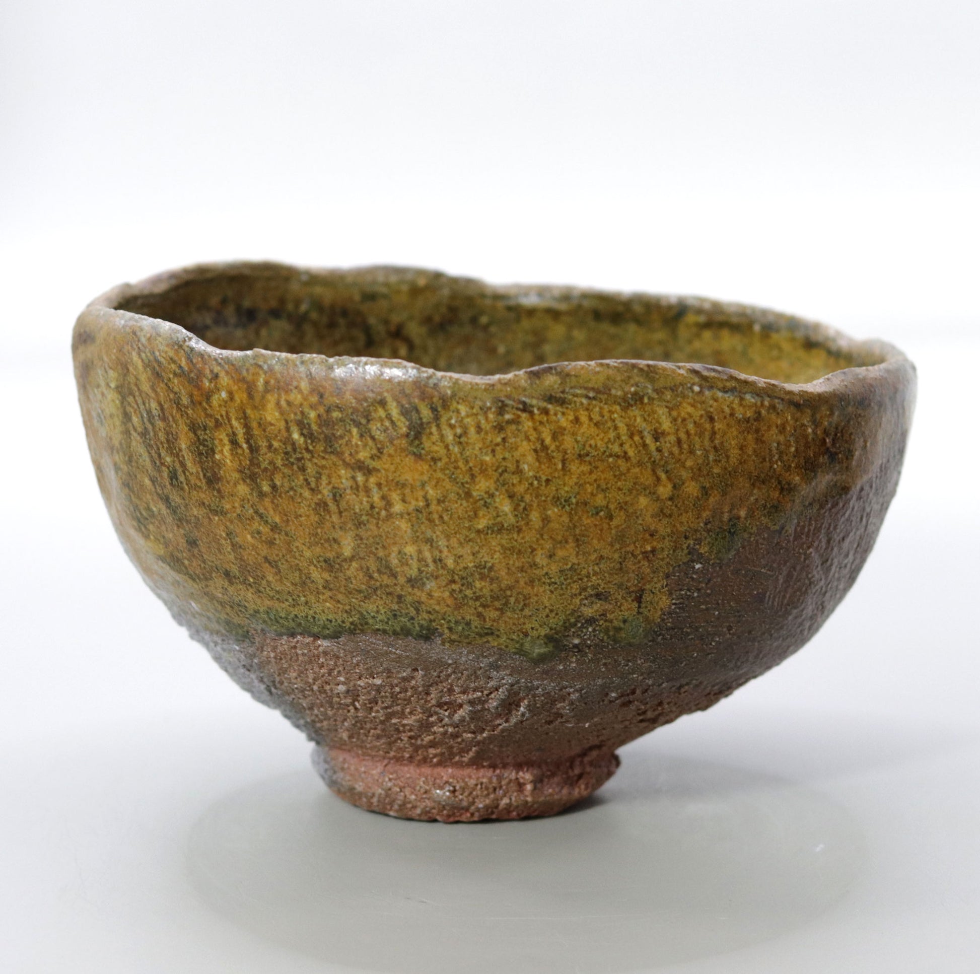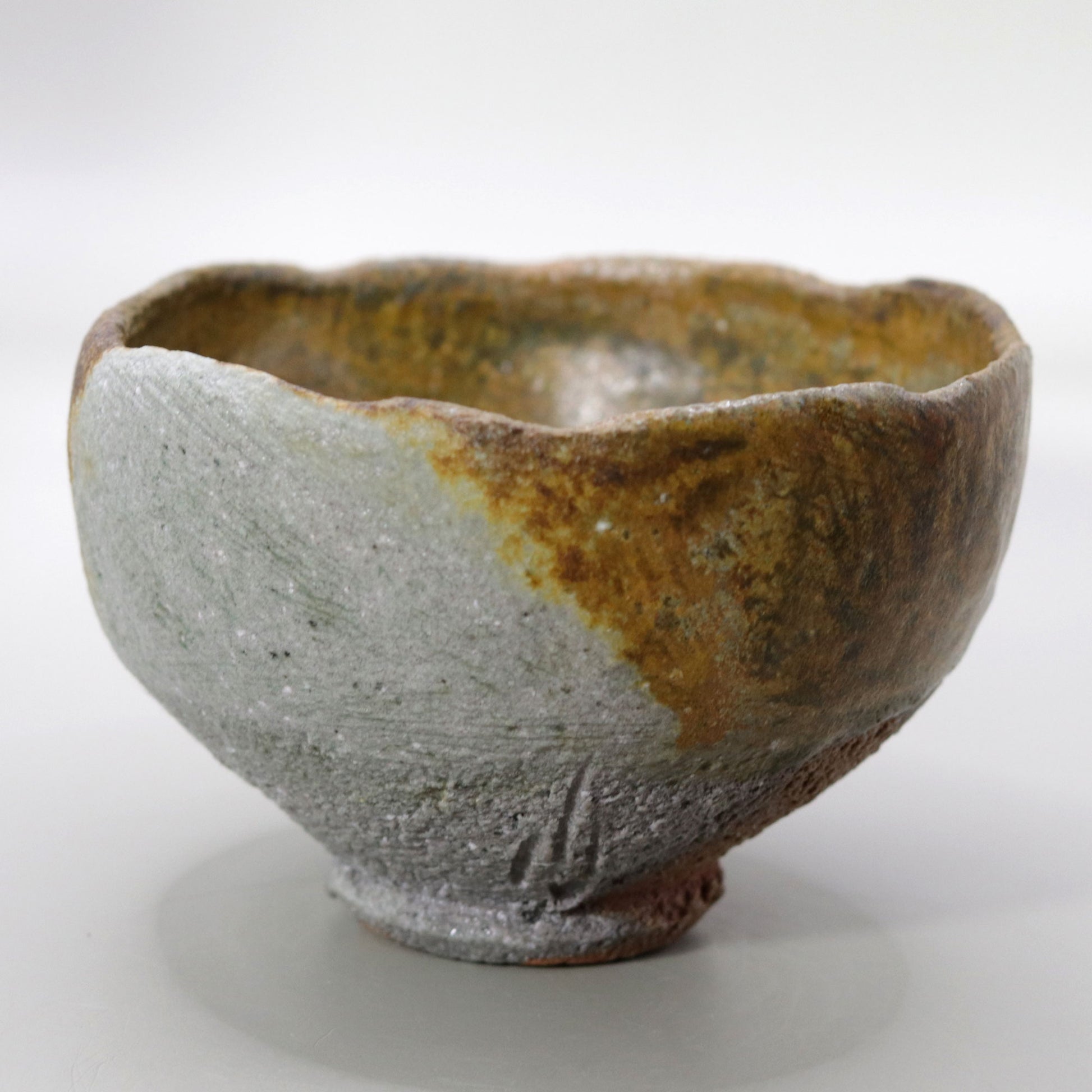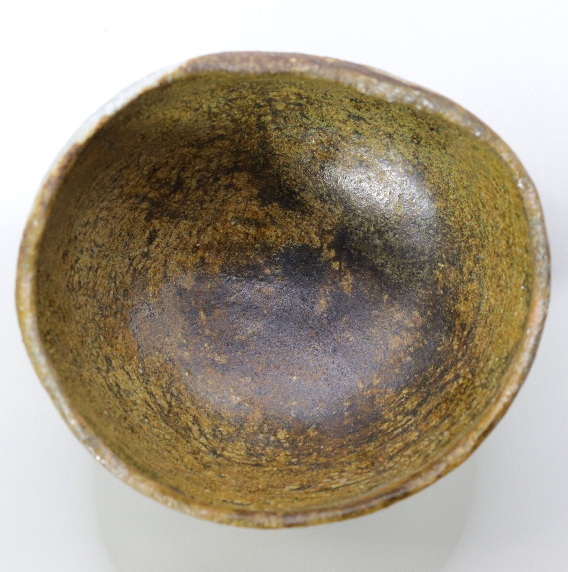 茶盌全体に広がる自然釉の色合いは、苔や古い銅の錆びのような自然の一部を連想させます。これらの深い緑の色調は、自然界の静けさや豊かさを感じさせ、茶の湯の場に穏やかで瞑想的な雰囲気をもたらします。茶盌の中に広がる自然の景色は、心を落ち着かせ、茶のひとときをより深い精神的なものへと導いてくれます。