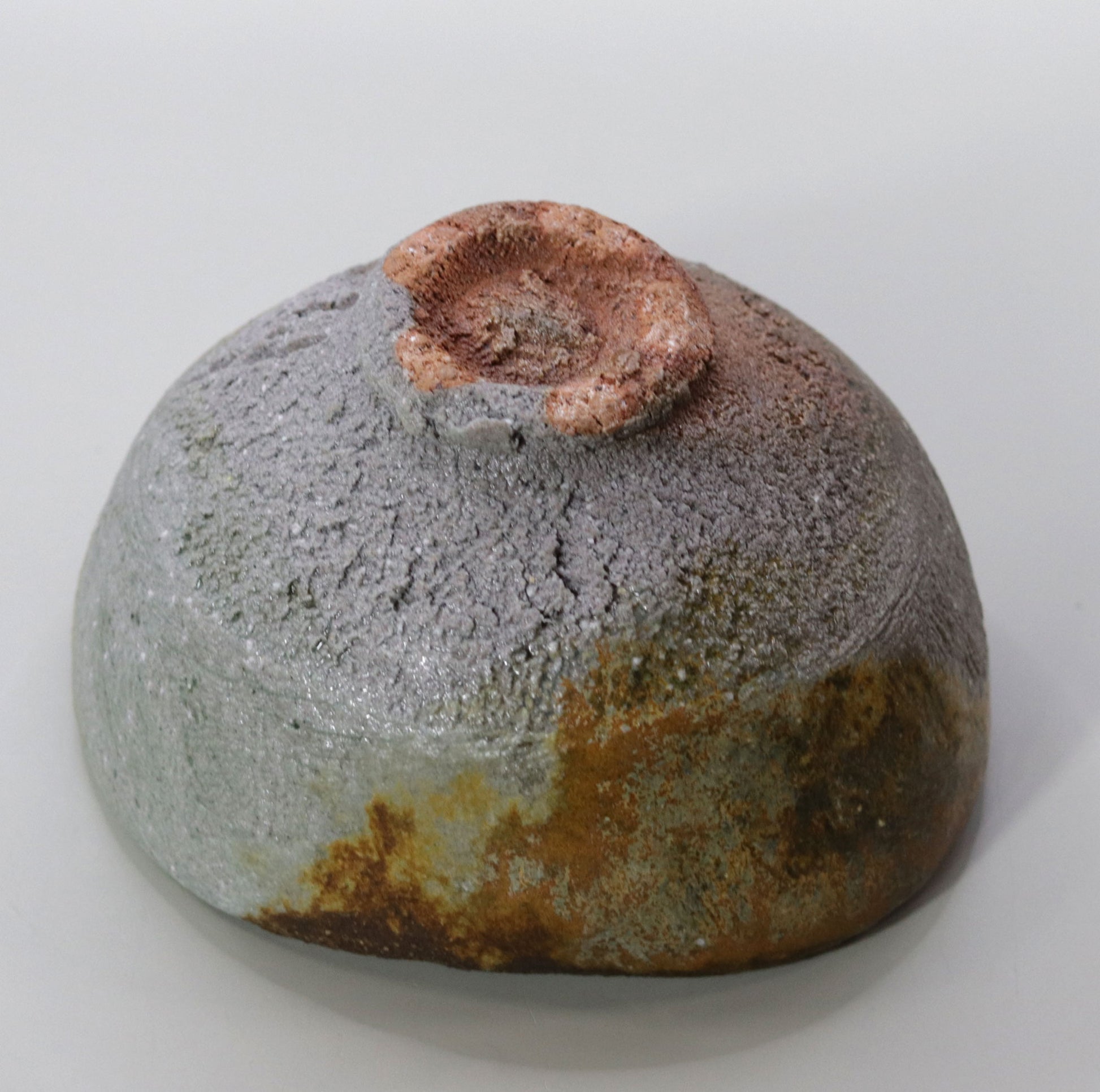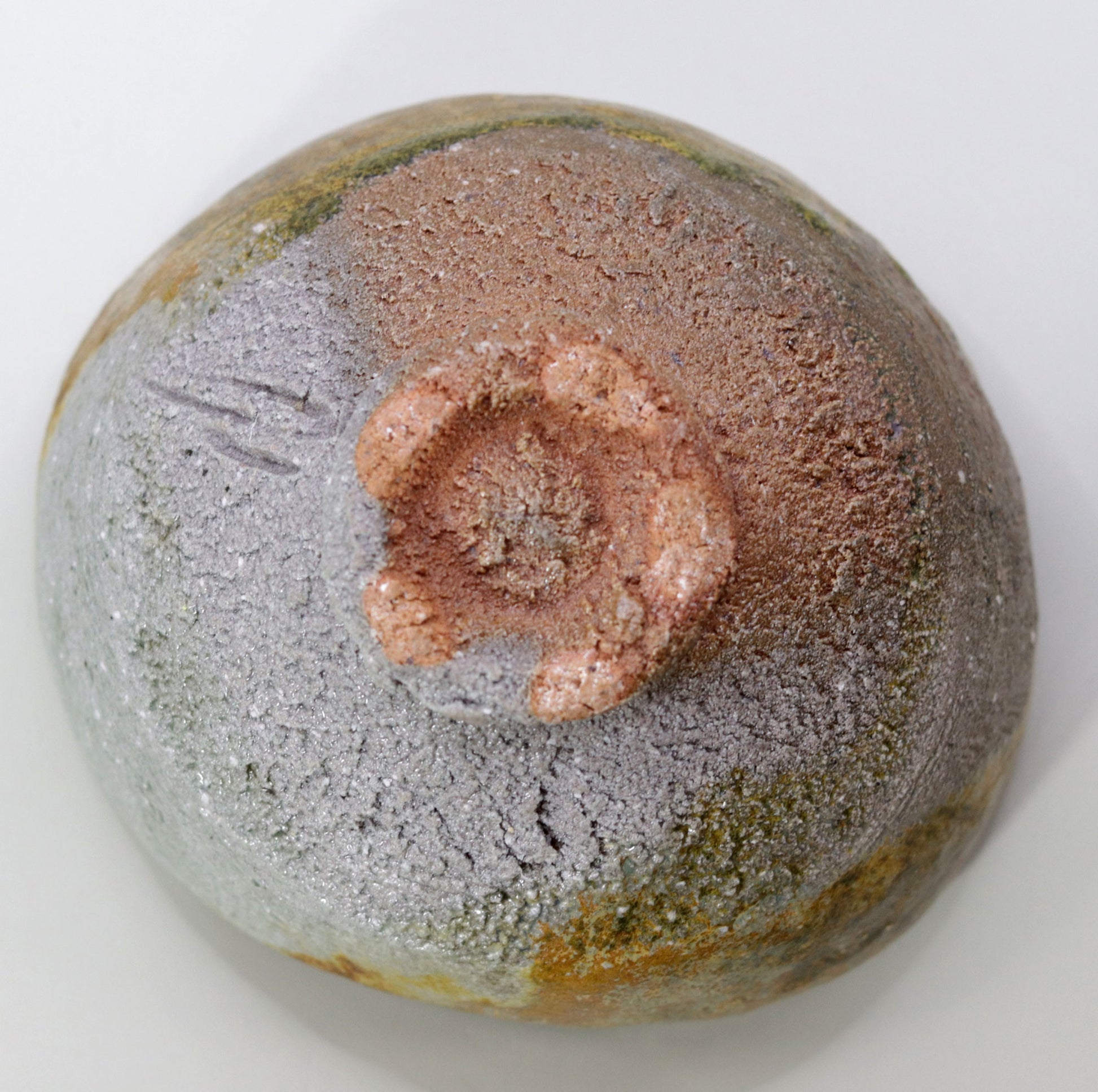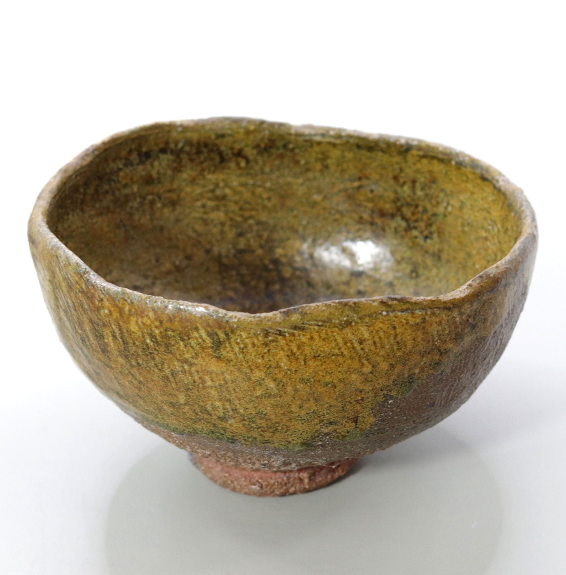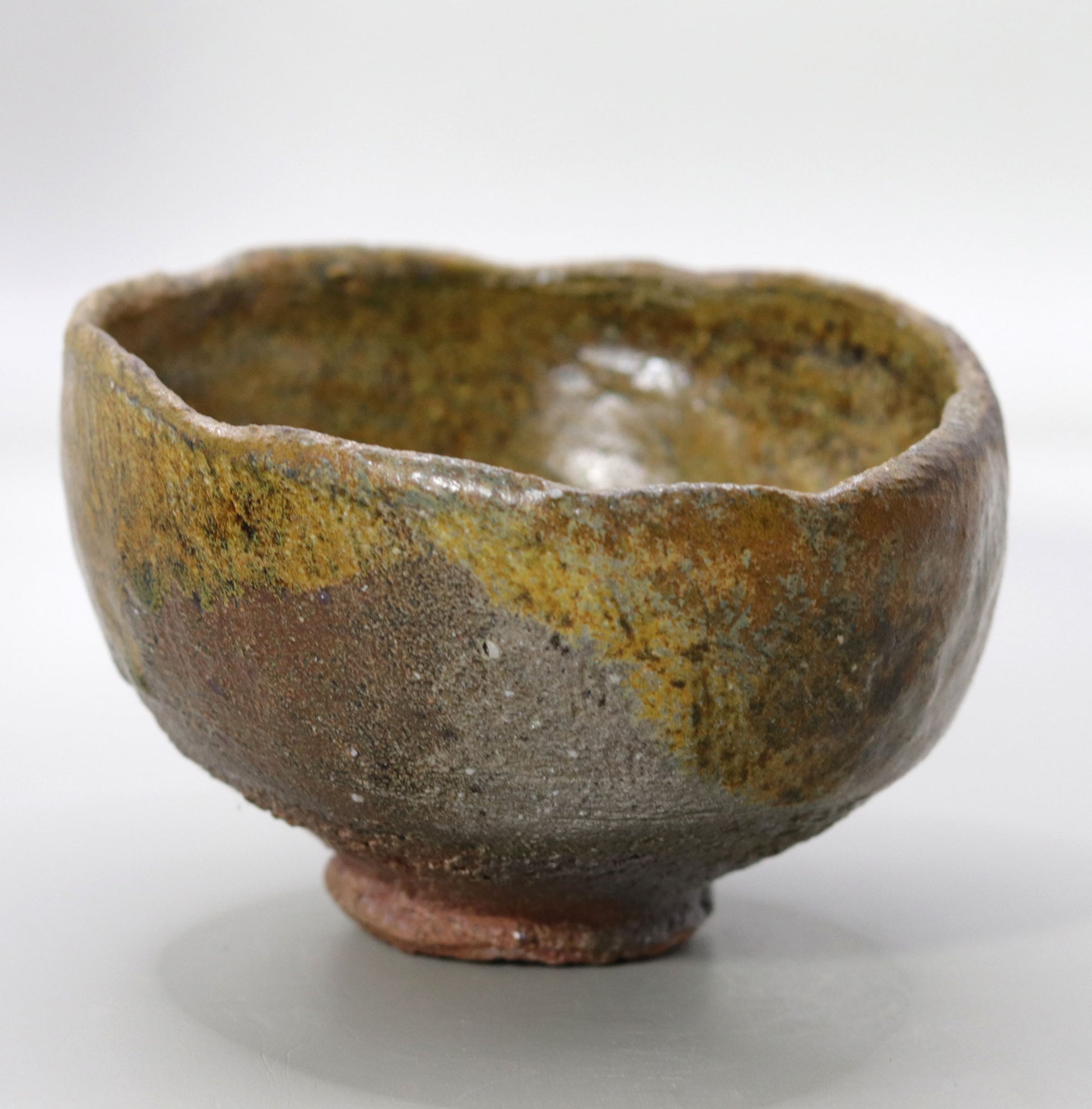 茶盌全体に広がる自然釉の色合いは、苔や古い銅の錆びのような自然の一部を連想させます。これらの深い緑の色調は、自然界の静けさや豊かさを感じさせ、茶の湯の場に穏やかで瞑想的な雰囲気をもたらします。茶盌の中に広がる自然の景色は、心を落ち着かせ、茶のひとときをより深い精神的なものへと導いてくれます。