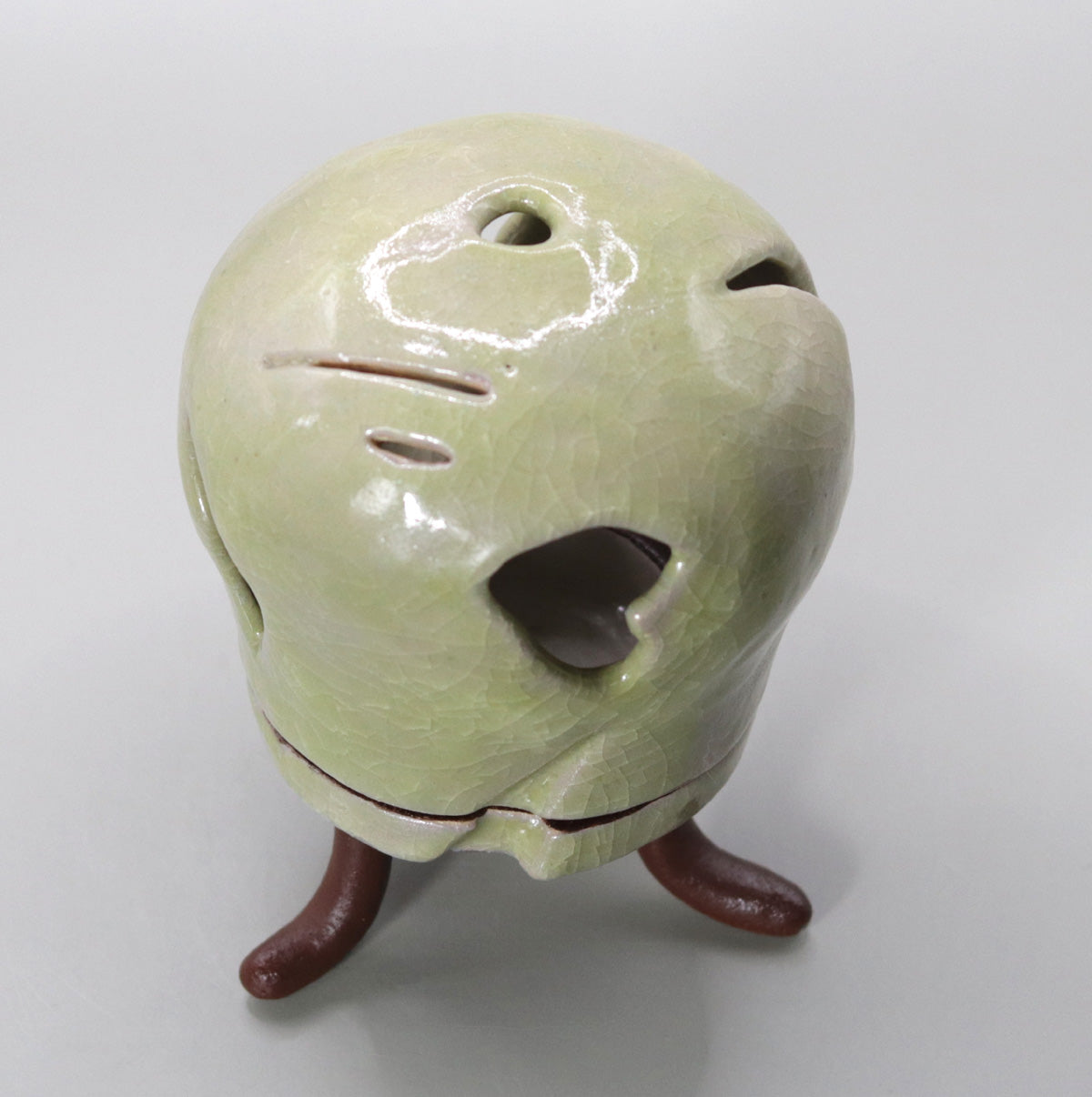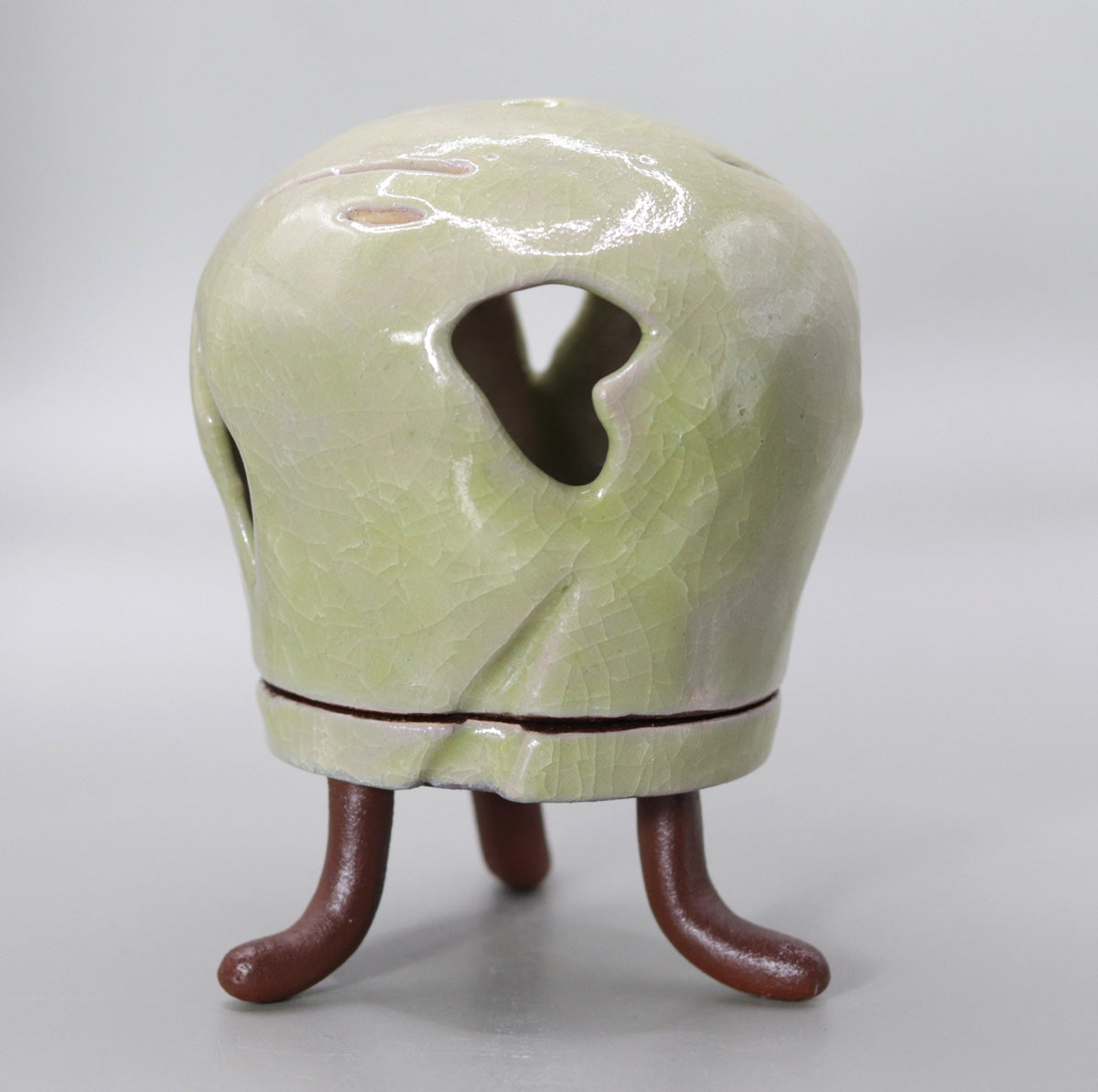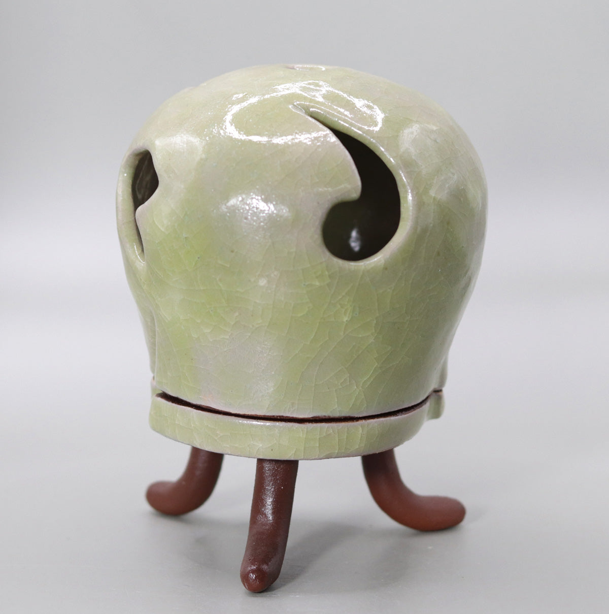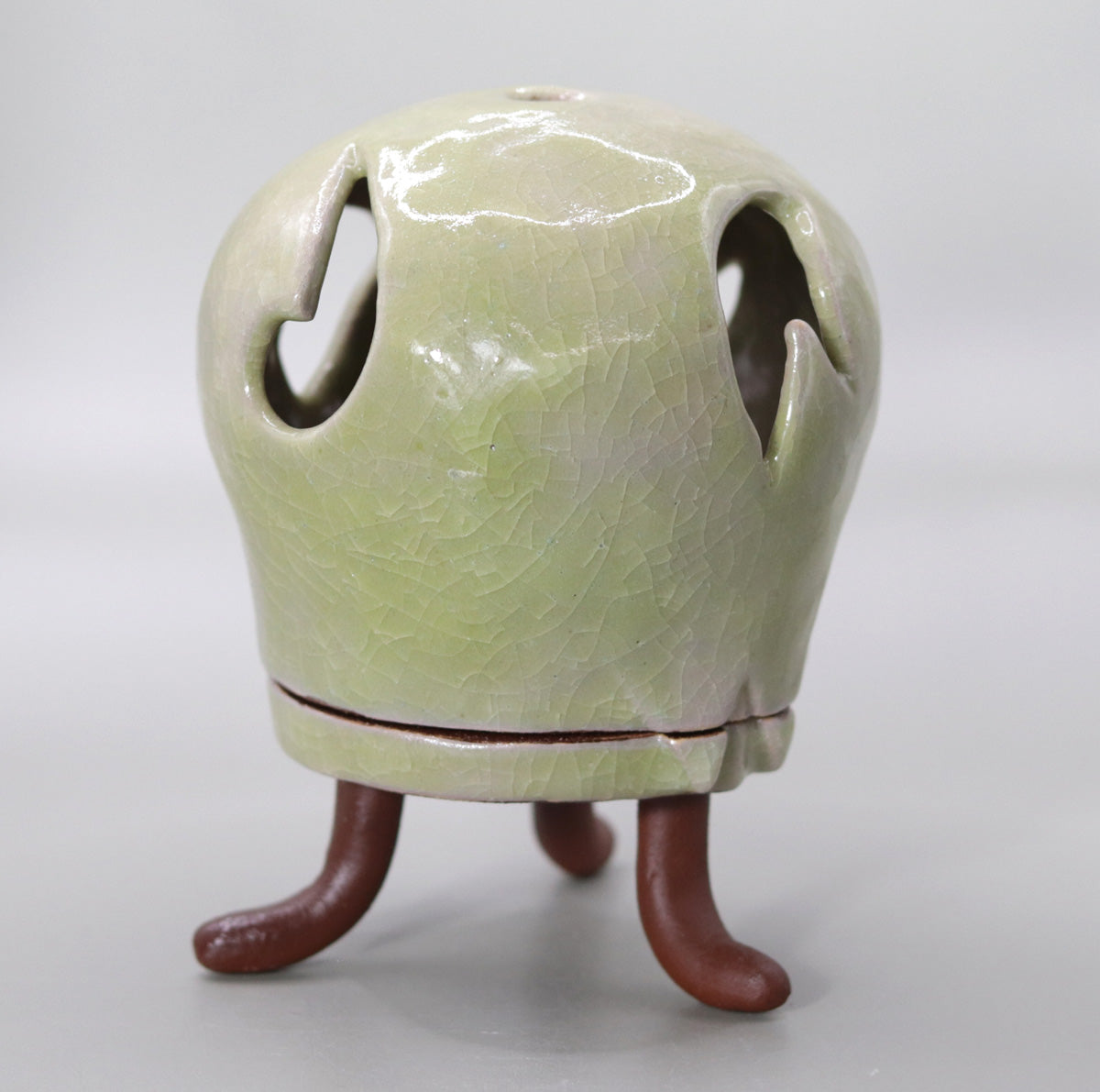 特徴的なのは、作品の足元を支える三本の脚。土を捻り上げたような有機的な曲線を描きながらも、全体のバランスはあくまで静謐であり、軽やかで可憐な印象を与えます。その脚が空間との距離を生み、香の煙がすうっと立ち上がる余白をつくることで、香爐本来の役割――「香を中心とした空間の設計」を、より豊かに演出します。