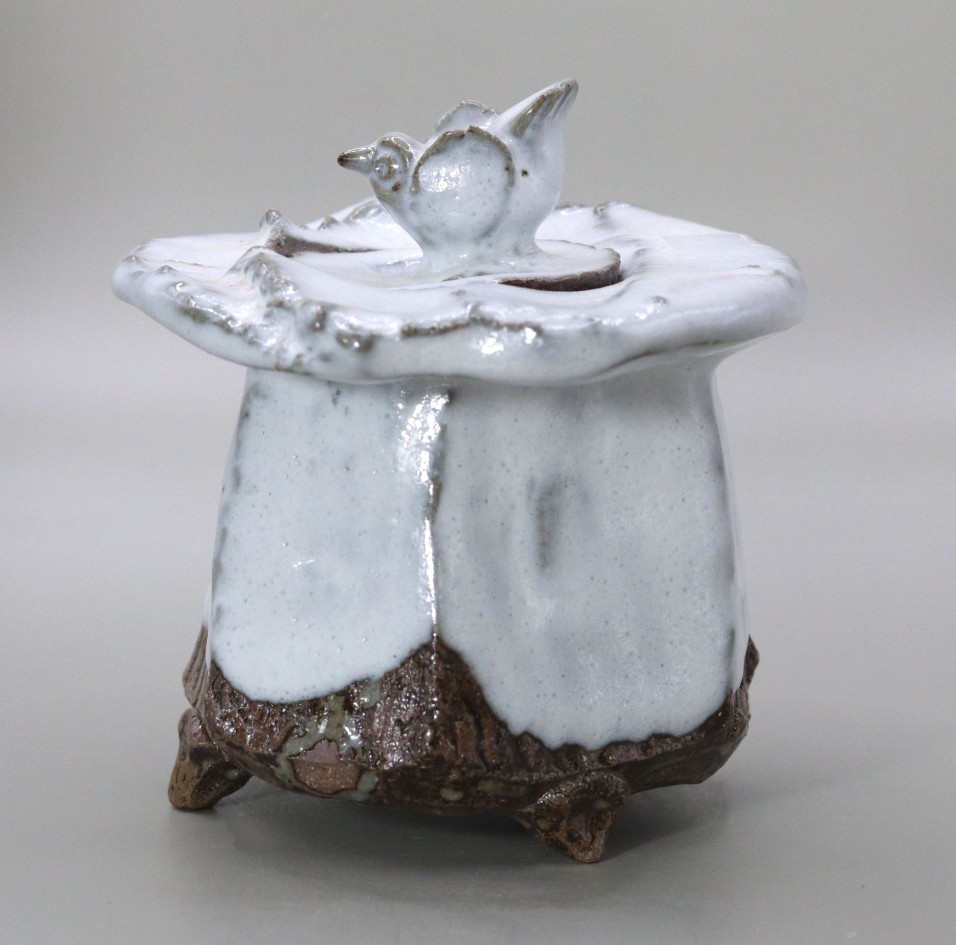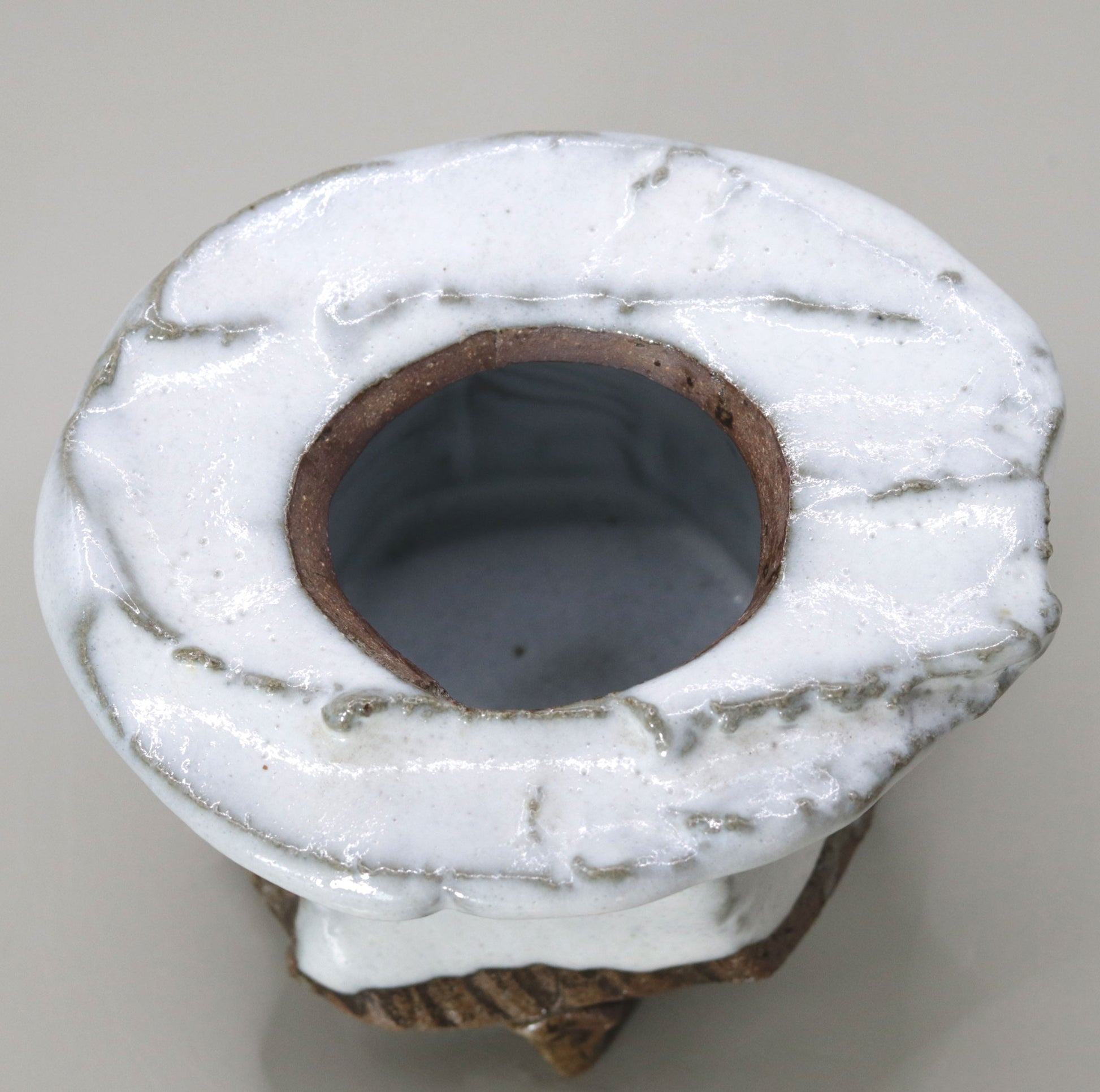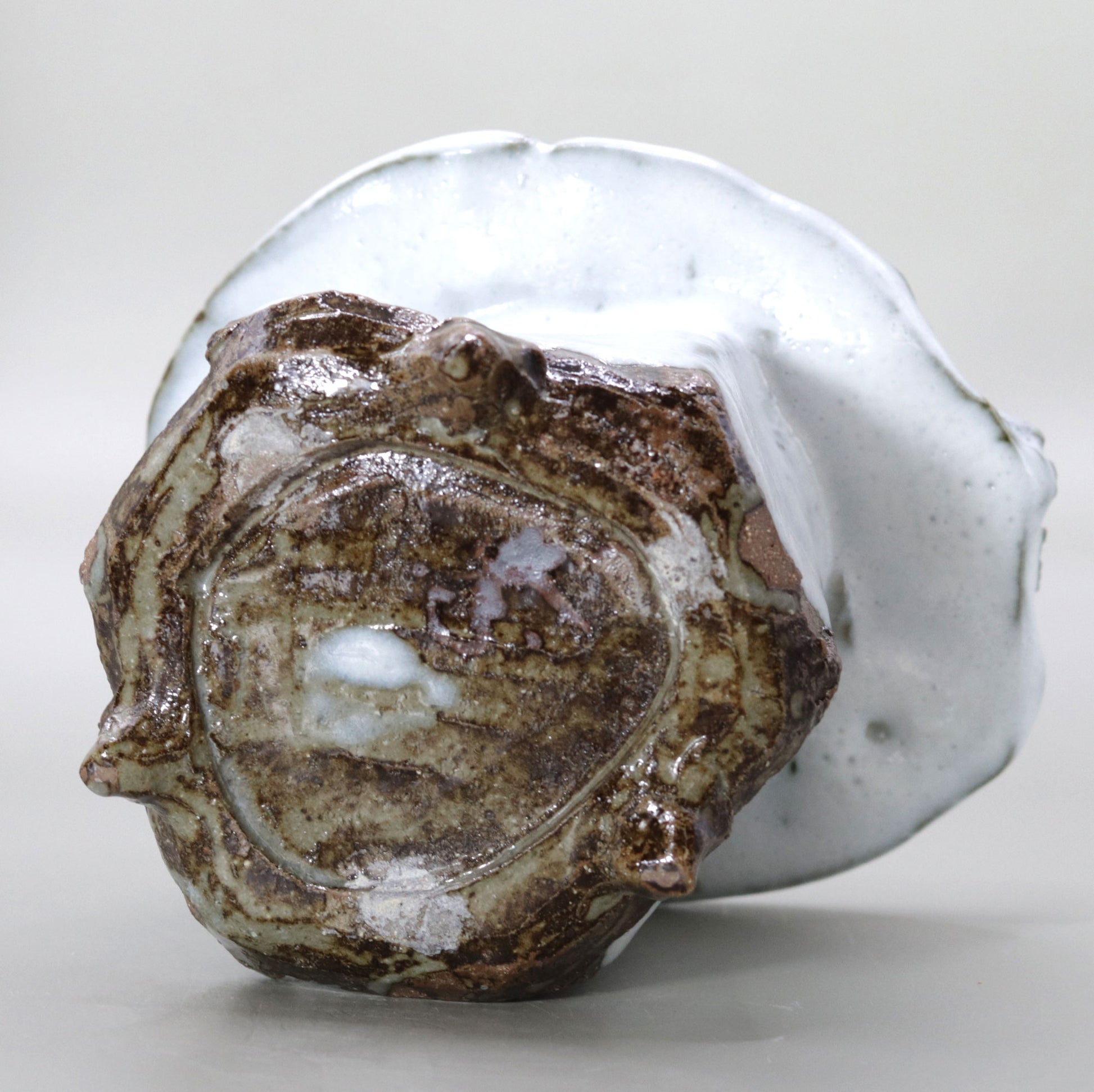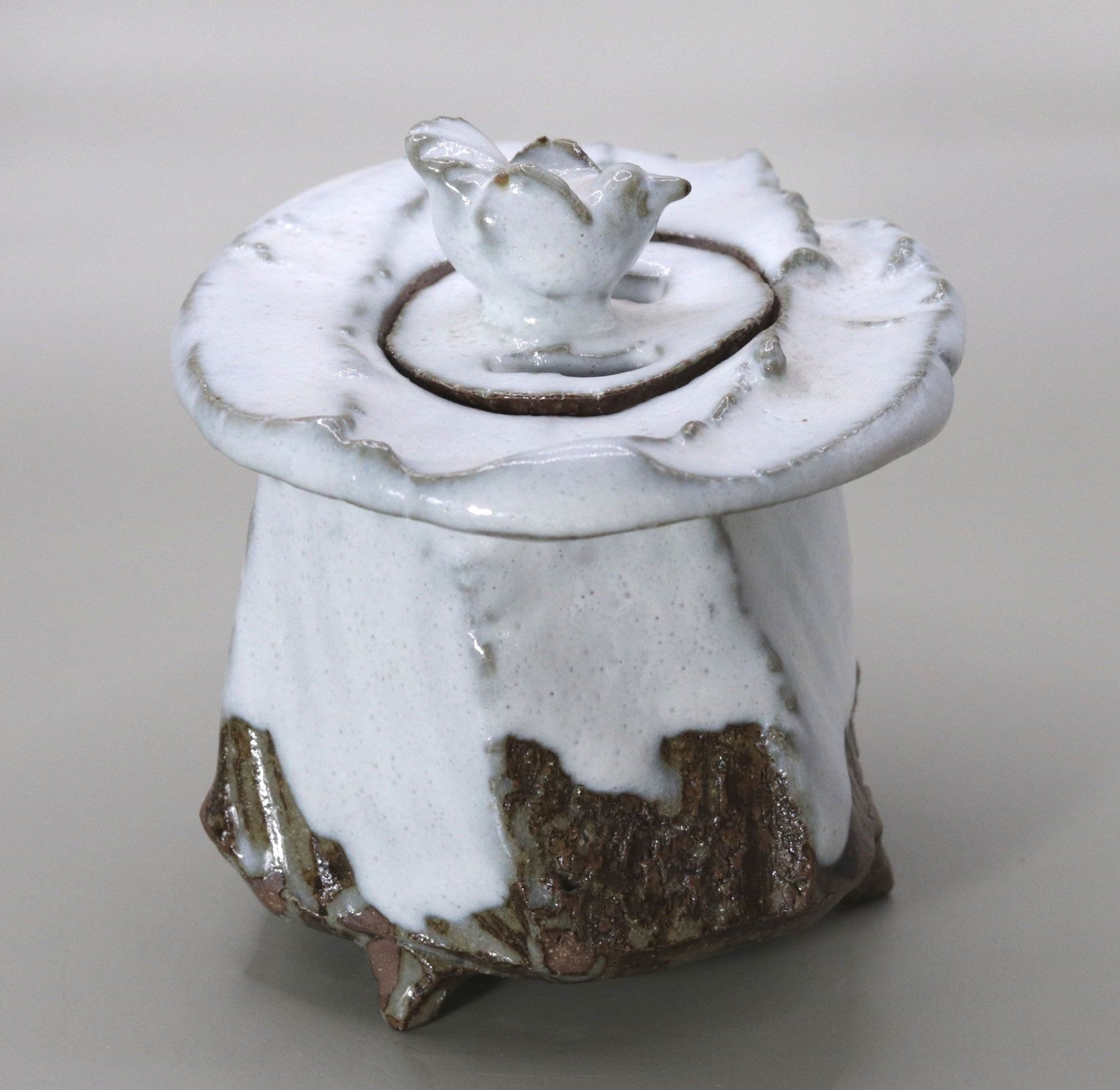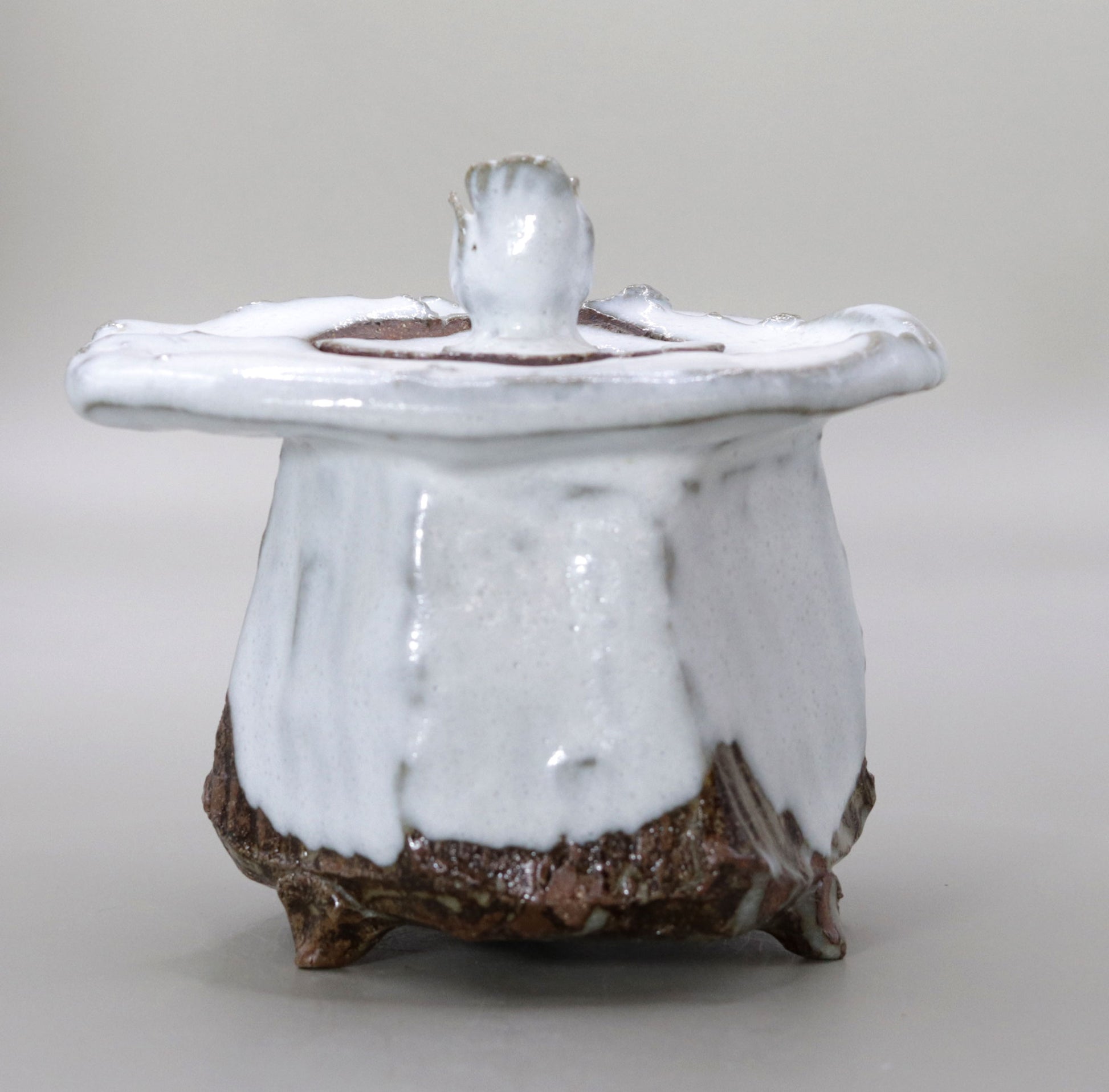 竹村繁男様の「灰釉香炉」は、白くとろりとした釉薬が全体を包み込むことで、柔らかな温かみと自然の力強さが調和しています。釉薬の質感と豊かな色彩が土の力強い表情と融合し、深みのある美しさを醸し出しています。作品には灰釉特有の温かみが漂い、手作りの陶器ならではの重厚な存在感が見る者の目を引きつけます。