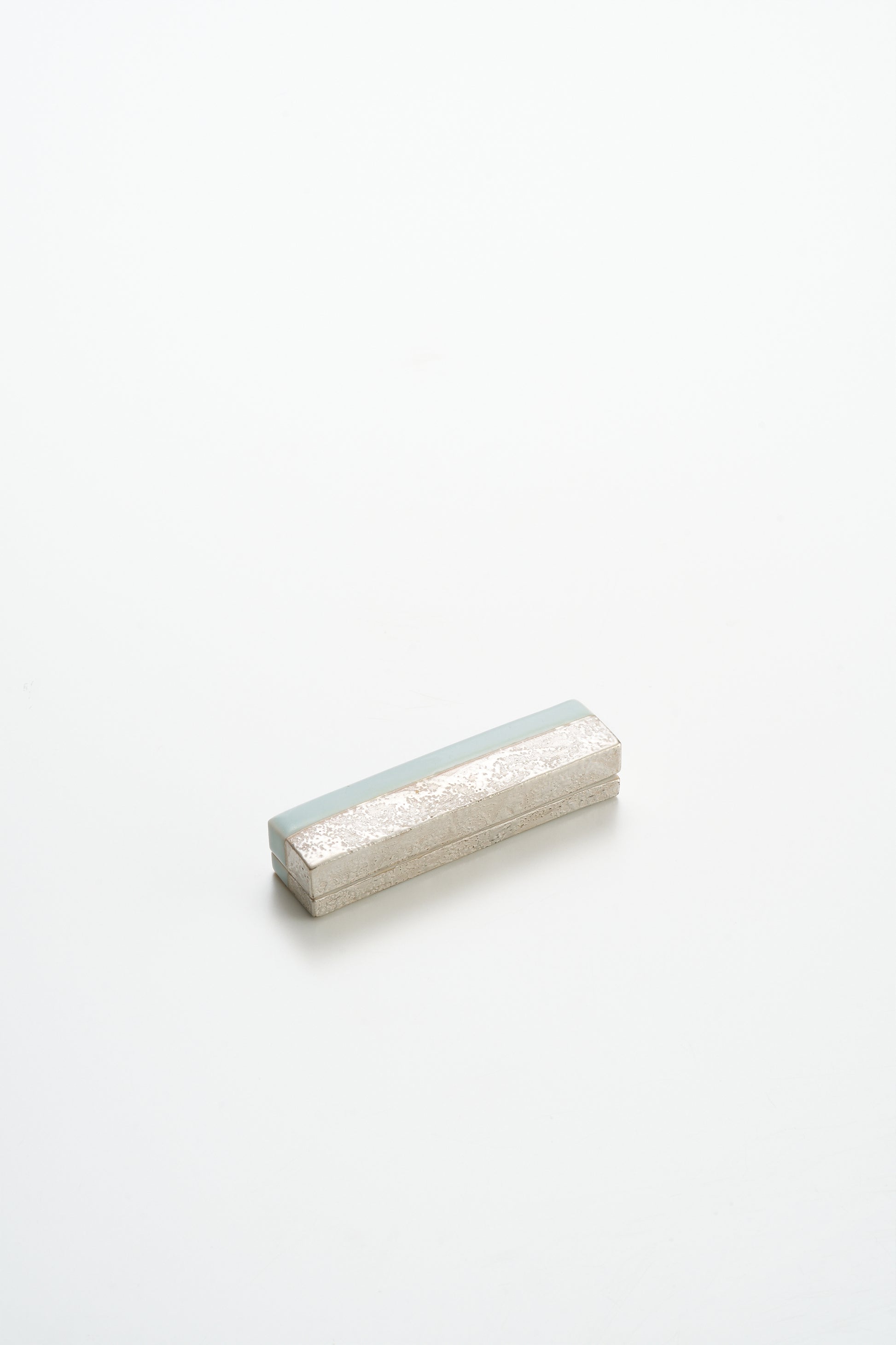 青白磁銀彩陶筥は、薄く長い“線の造形”に、青白磁の静水と銀彩の霜の気配を重ねた、極めて洗練された小筥です。銀彩が端で句読点を打ち、淡青が余白を伸びやかに保つ。閉じても開いても所作が整い、空間が澄む。