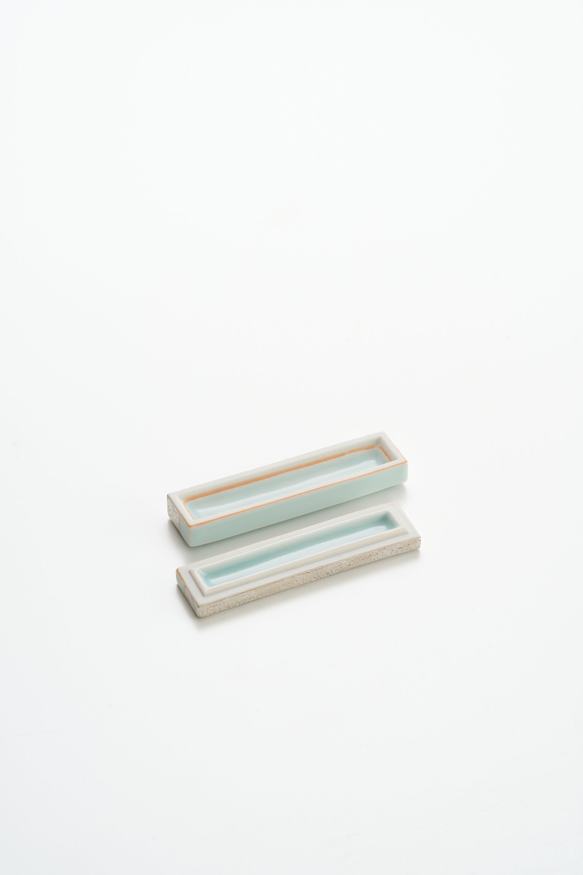 蓋を外すと、内側には淡青の細長い見込みが現れます。まるで細い水路のように、静かな余白が一直線に伸びる。