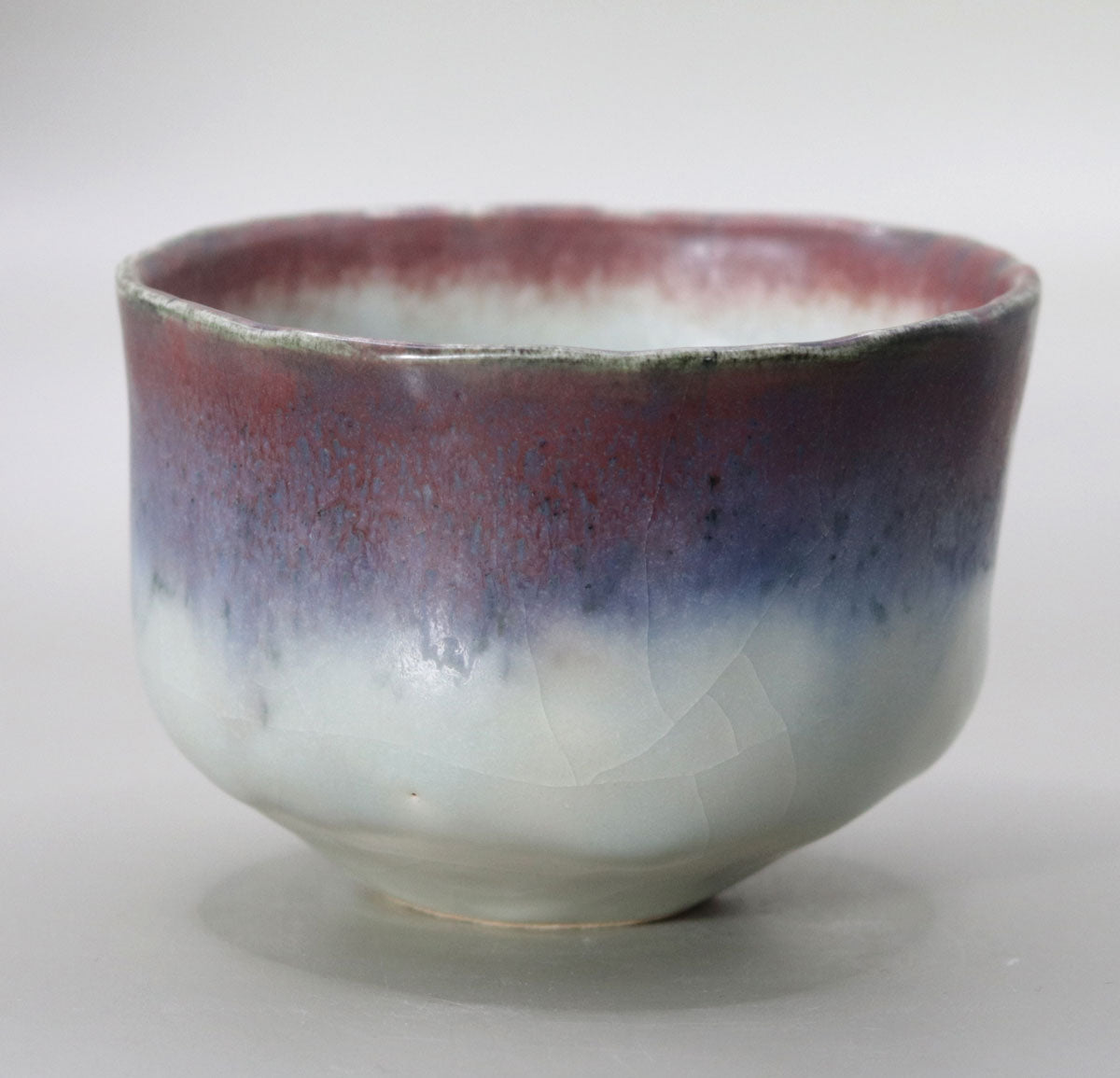 藤平寧様の「茶盌」は、赤紫、青、白の美しい色彩のグラデーションと、手捻りによる自然なフォルムが調和した作品です。この茶盌は、茶道具としてだけでなく、空間を彩るインテリアとしても優れた存在感を放ちます。