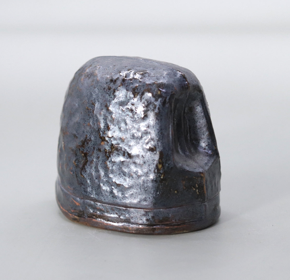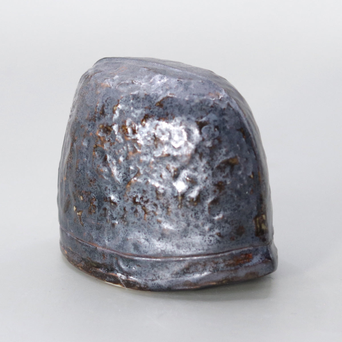 透明釉に酸化鉄を加え、強還元で焼成することにより、群青から墨黒へ移ろう“青鉄”の発色が得られています。局所的に紫褐の窯変斑が生じ、長年使い込まれた黒漆の艶を思わせる奥行きを生んでいます。