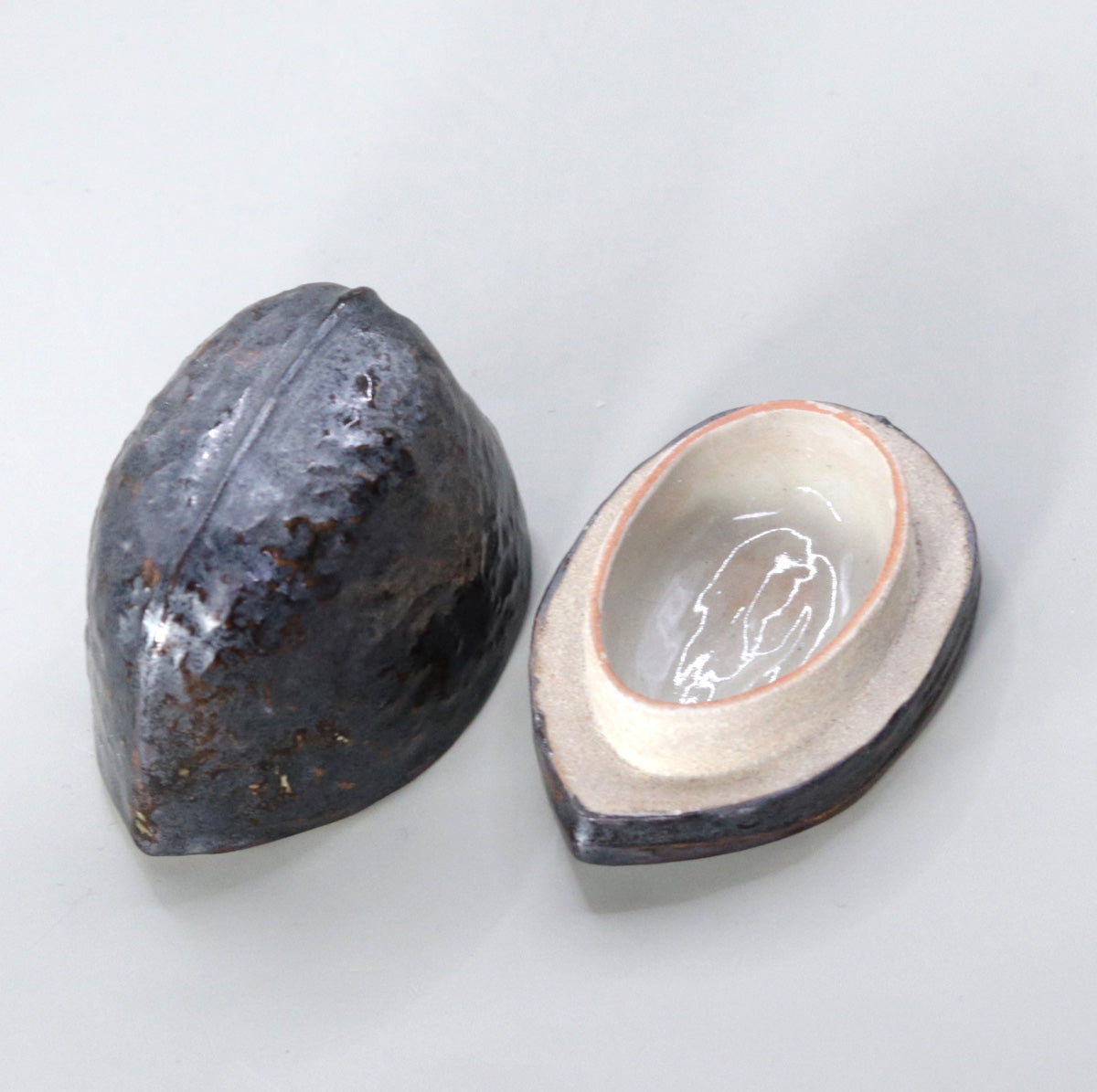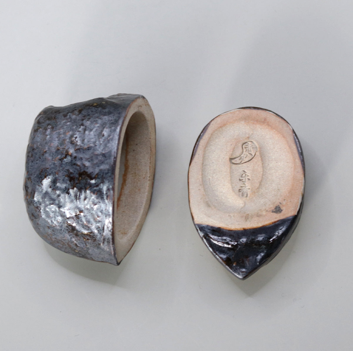 尾西楽斎様は「奈良の歴史と祈りを掌上の茶陶へ」という理念の下、鹿・梵鐘・夢殿など土地の象徴的モティーフに加え、日本文化の原型を示す装束や祭具を積極的に題材に取り込まれています。本作では、赤膚土の鉄質と青鉄釉の結晶を活かし、衣紋の張り・布目の静謐を土の質感で表現。掌に包むと、まるで平安貴族の装束が奏でる静かな呼吸が伝わるかのようです。