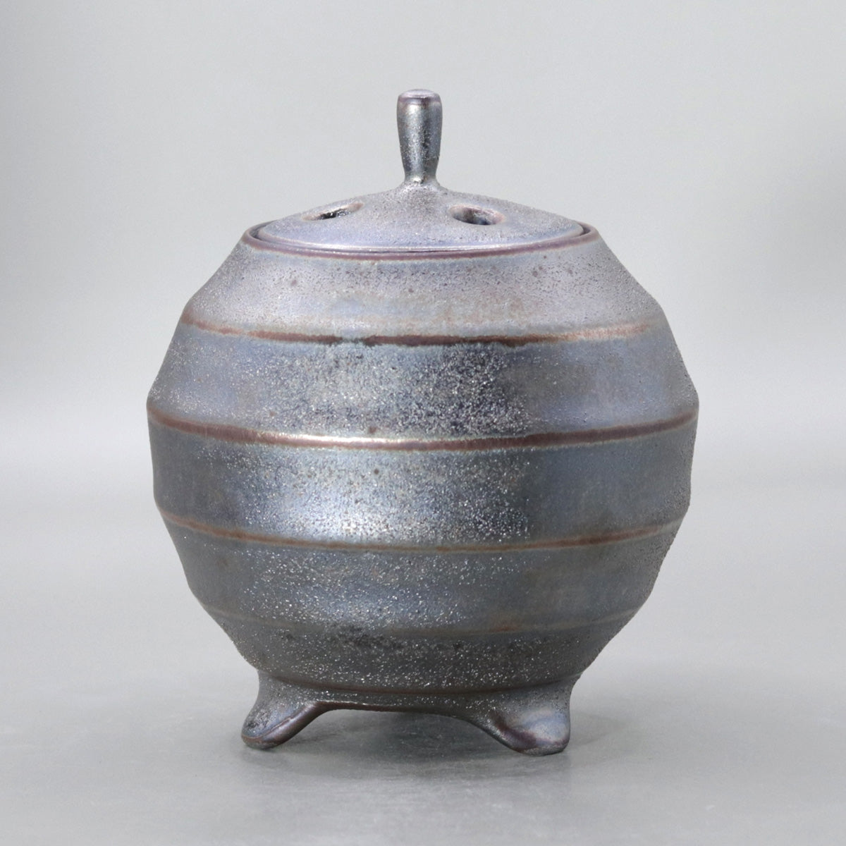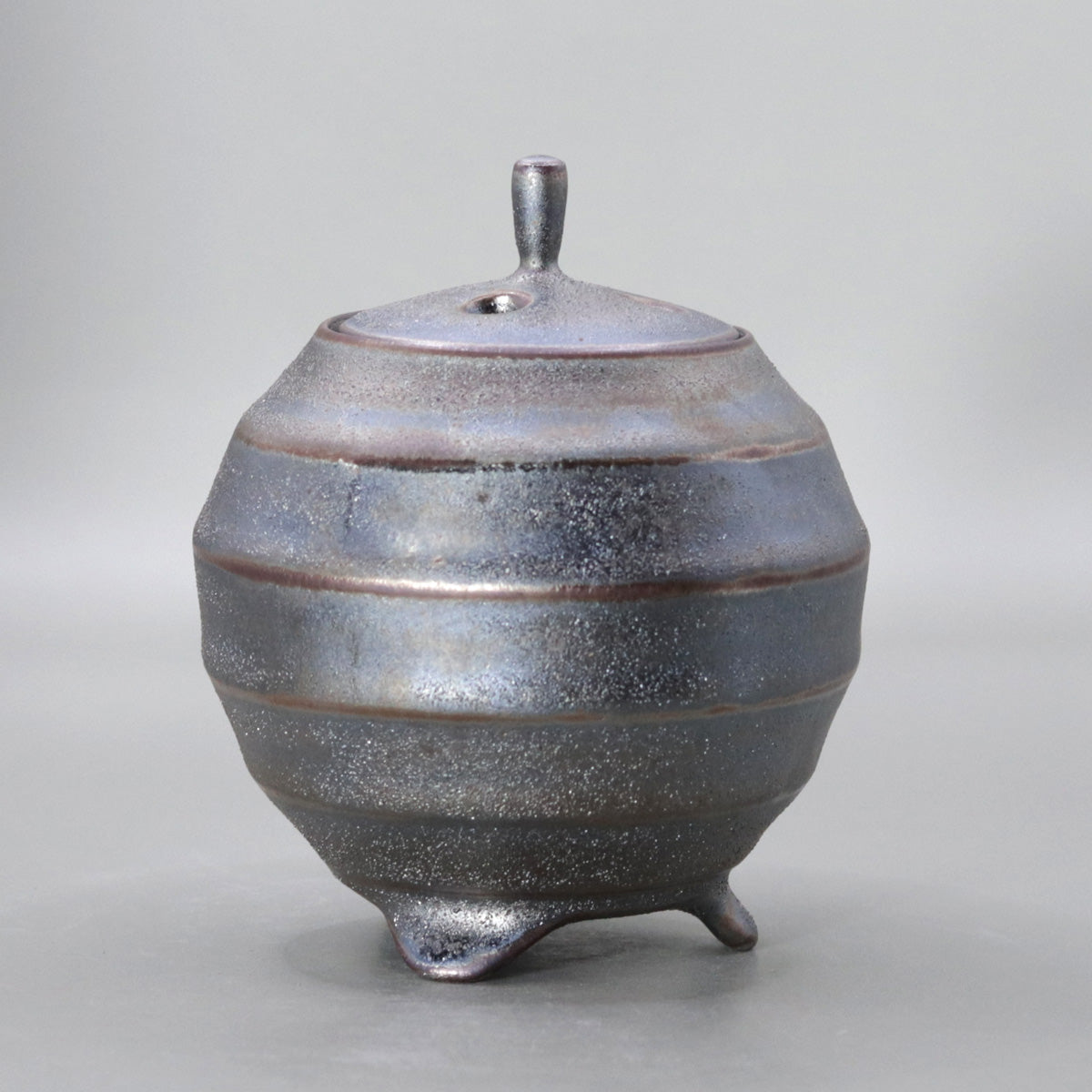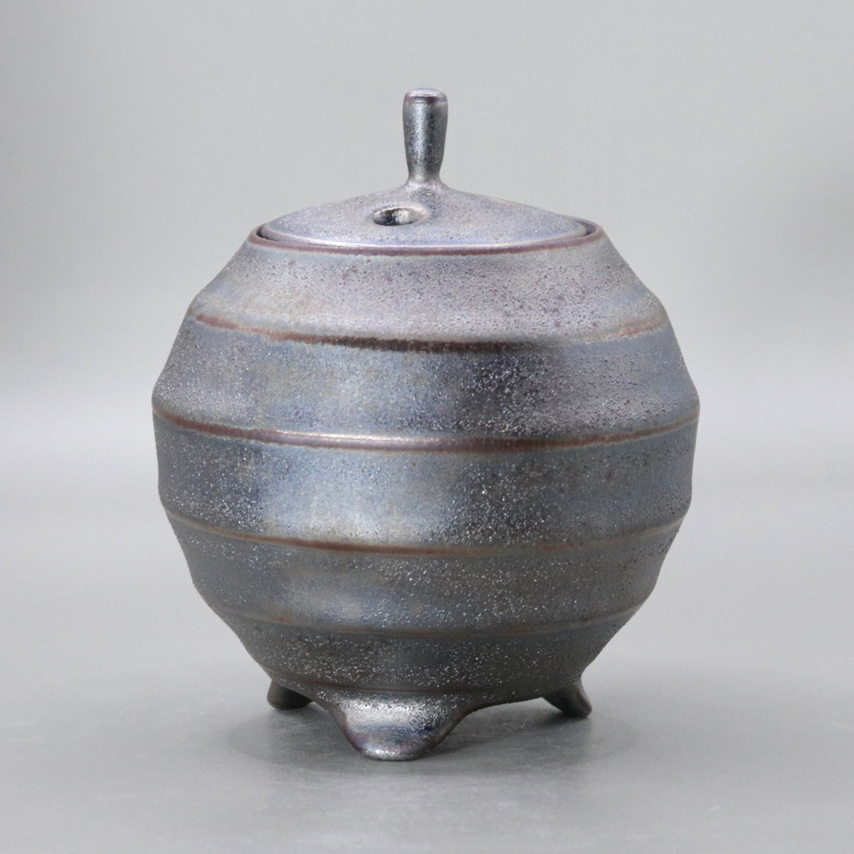 還元炎の中で育った鉄釉が、黒瑠璃の奥から銀蒼の微光を放ちます。胴と蓋に刻まれた段削りは六条──山稜を重ねる夜雲のリズムを想わせ、その稜線に走る薄紅の火間(ひま)が闇へ温度を添えています。蓋摘みは細身の塔のように立ち上がり、香煙が立ちのぼる導線を静かに示唆。三脚の脚先が卓上に影を落とし、まるで香雲が器下から湧き出るかのような浮遊感を演出します。