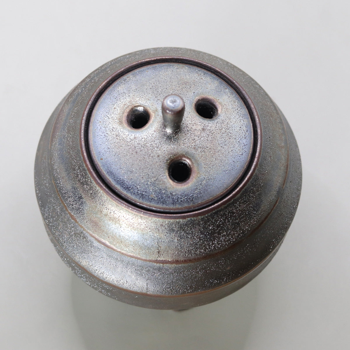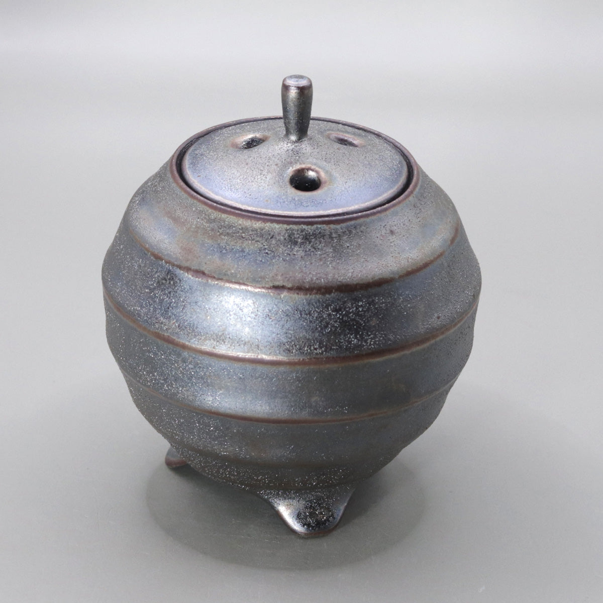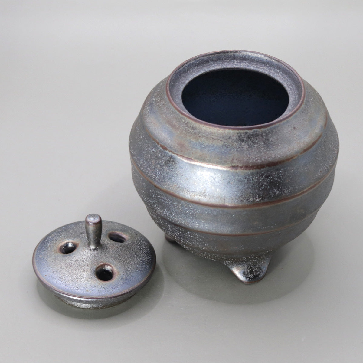 還元炎の中で育った鉄釉が、黒瑠璃の奥から銀蒼の微光を放ちます。胴と蓋に刻まれた段削りは六条──山稜を重ねる夜雲のリズムを想わせ、その稜線に走る薄紅の火間(ひま)が闇へ温度を添えています。蓋摘みは細身の塔のように立ち上がり、香煙が立ちのぼる導線を静かに示唆。三脚の脚先が卓上に影を落とし、まるで香雲が器下から湧き出るかのような浮遊感を演出します。