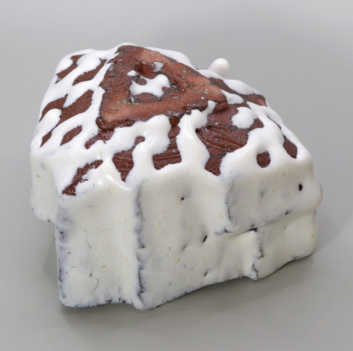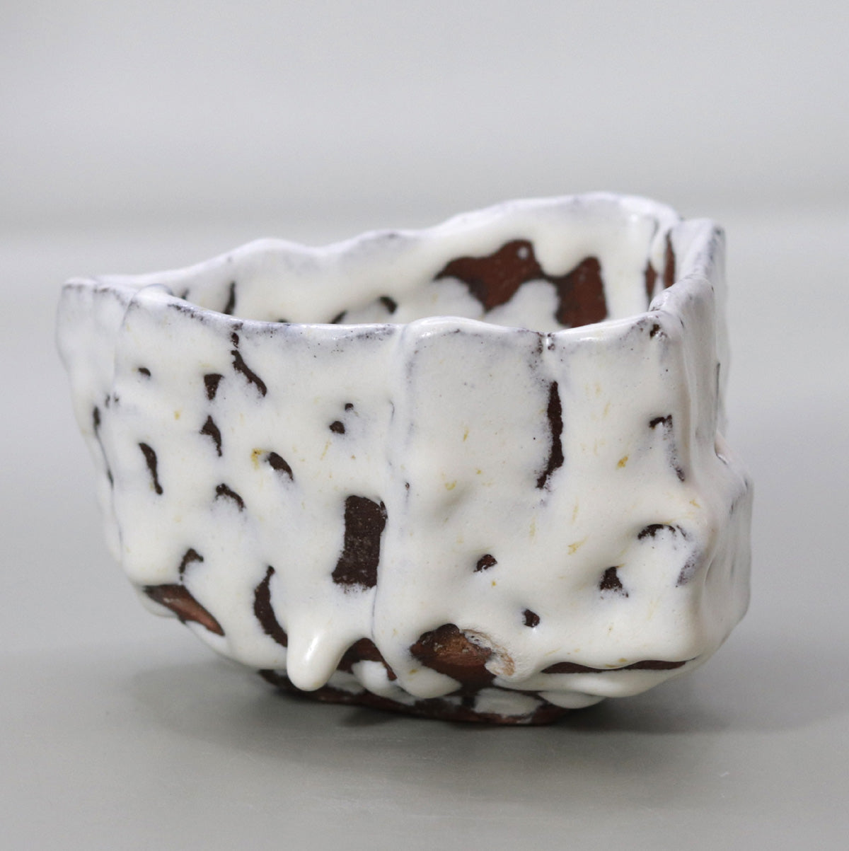 本作の最大の見どころは、厚く掛けられた藁白釉が外壁をゆったりと流下し、まるで雪解け水が岩肌を伝う瞬間を凍結したかのような景色を生み出している点です。藁灰由来の柔らかな白は、ところどころで素地の赤褐色を透かし、複雑な濃淡と陰影を呼び込みます。滑り落ちた釉が自然に生む凹凸は偶然と必然のせめぎ合いであり、炎が描いた即興の筆致として視覚的な緊張感を高めています。