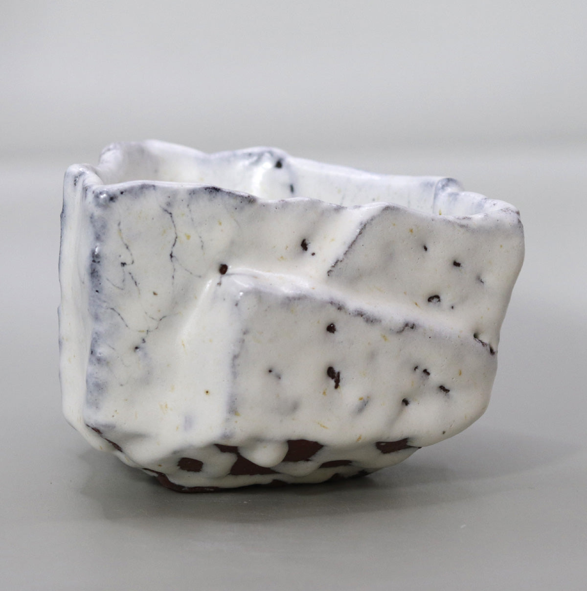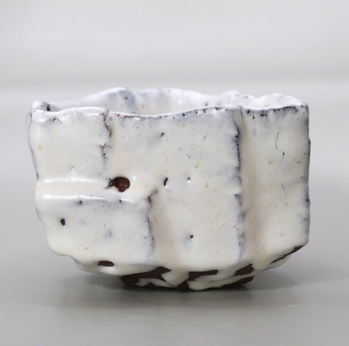 素地に用いられた赤味の強い丹波土が、釉の薄い部分や貫入の隙間から覗くことで、白釉との対比がいっそう際立ちます。土中の鉄分が炎と結託して黒褐色に発色し、雪白の肌に点描を散らす様は、夜の森に舞う火の粉を思わせる野趣を帯びています。底部近くに見られる釉の溜まりや縮み、泡痕(ほうこん)は、陶土と釉薬が高温で交わる瞬間をそのまま留めた“窯変の証し”として、器に生命力を吹き込んでいます。