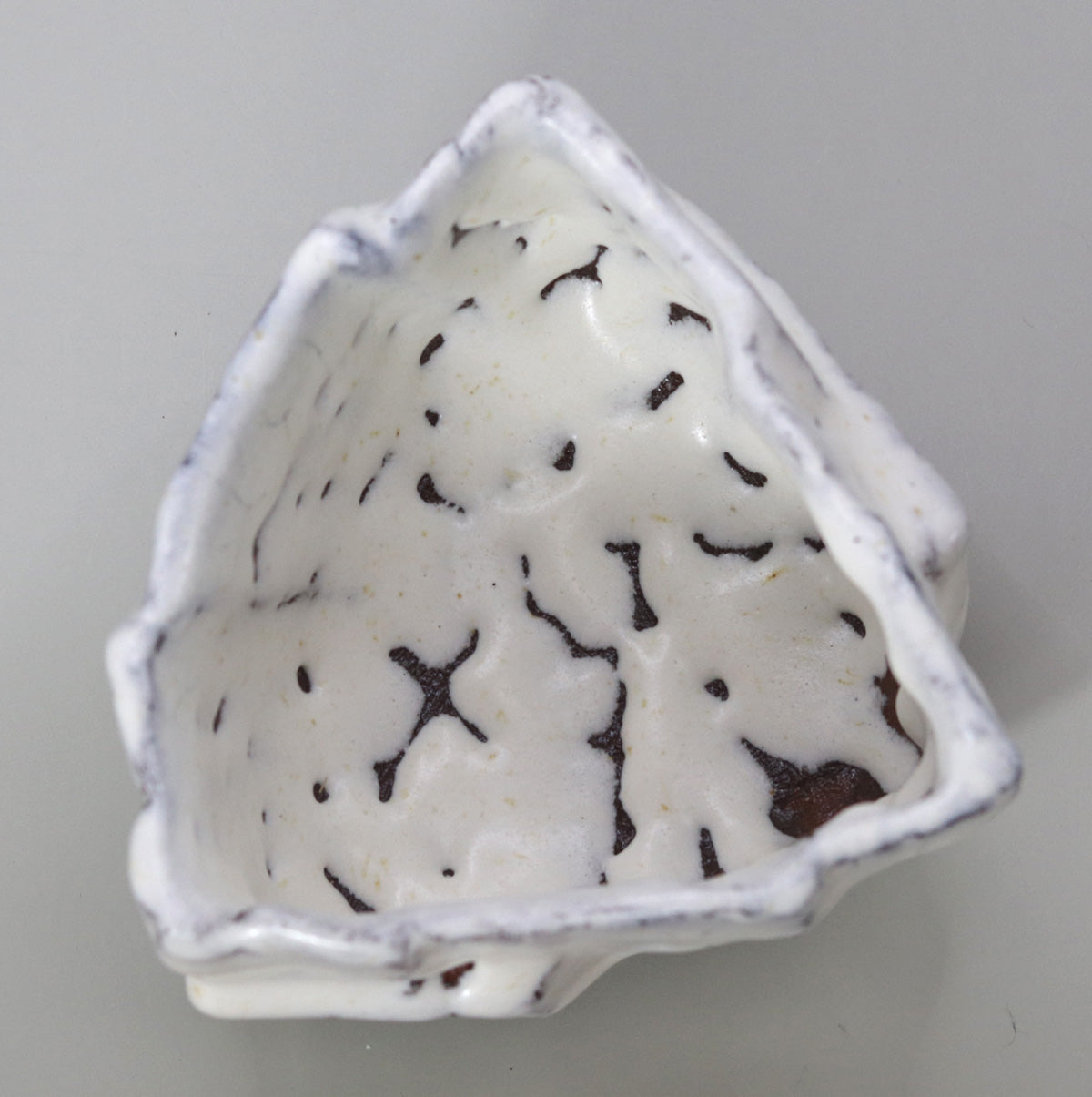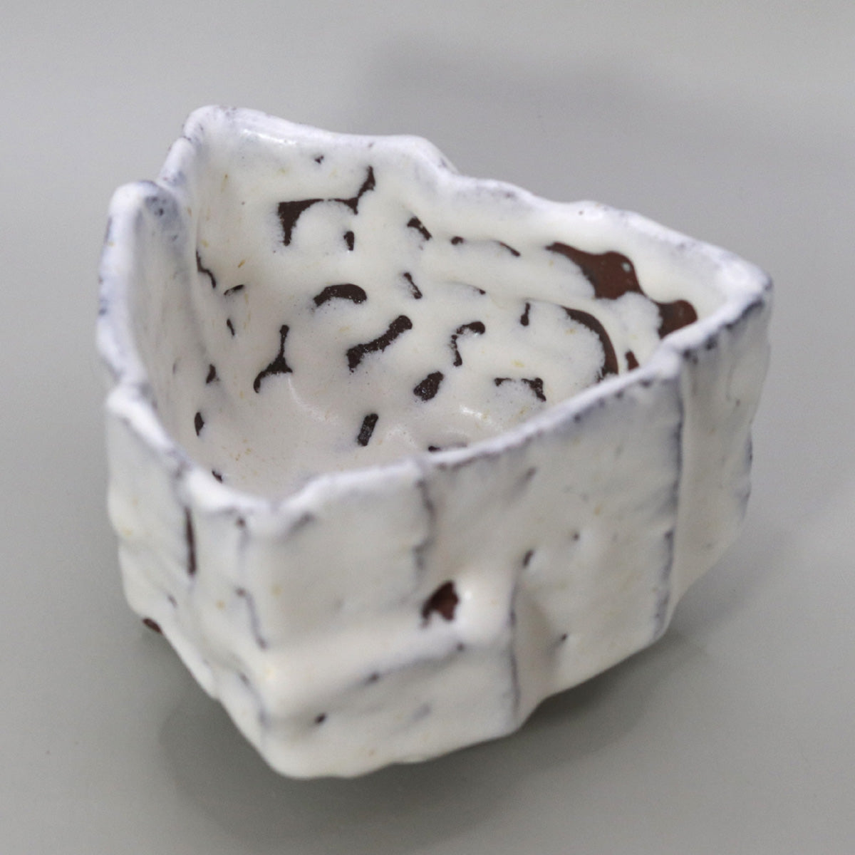 全体はほぼ正方形を基調としつつ、角は柔らかく押し広げられ、縁は波のように揺らいでいます。鋭角と曲線が交差する稜線が、光の当たり方によって強いコントラストを生み、器を回すたびに新しい表情が立ち現れます。掌に包むと四辺それぞれの面取りが指に心地よく掛かり、視覚的な大胆さと実用的な安定感が見事に両立しています。