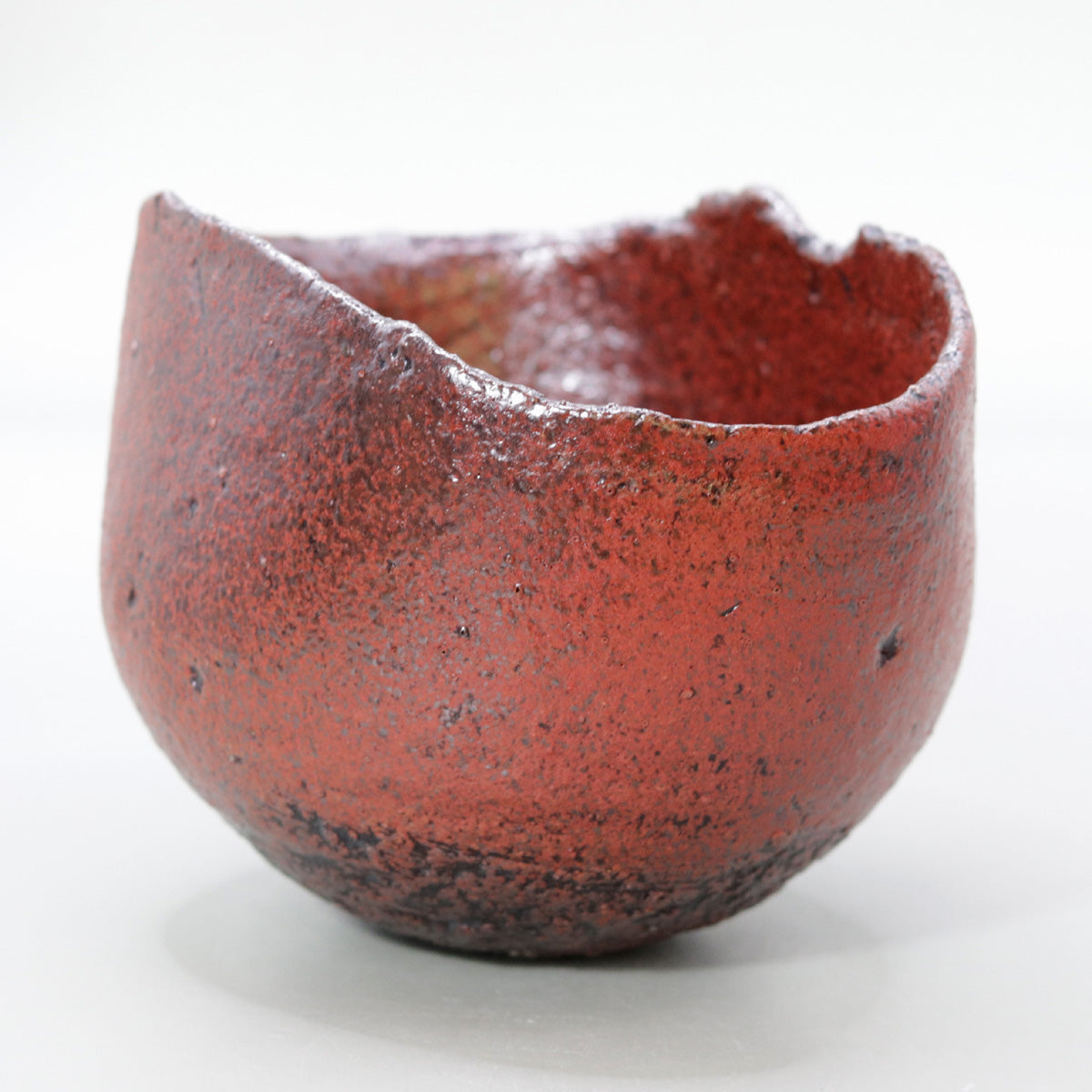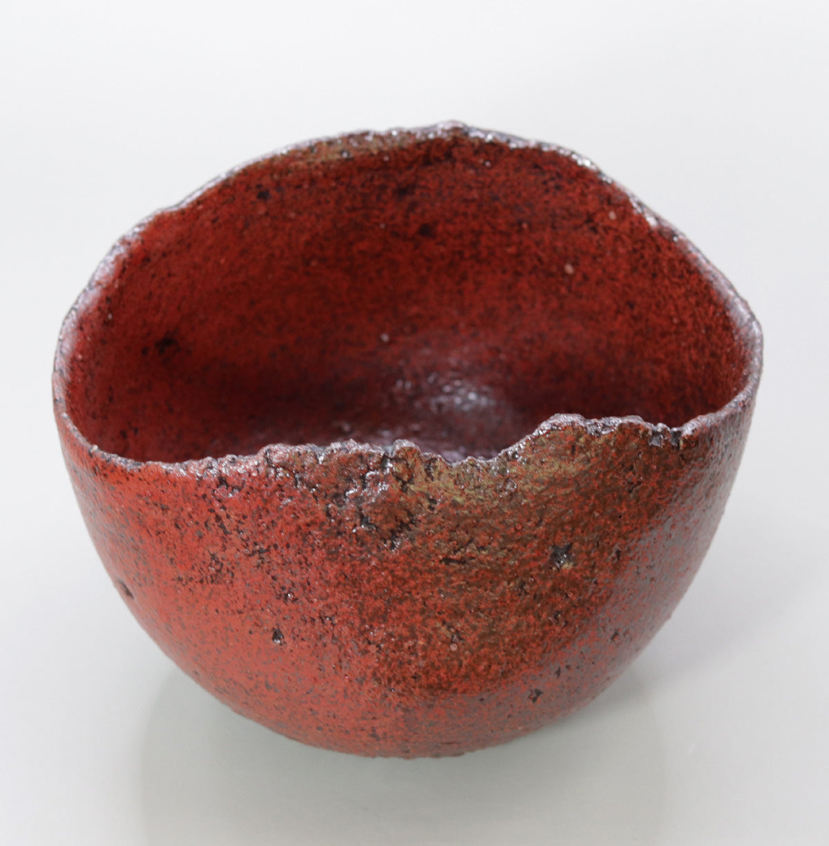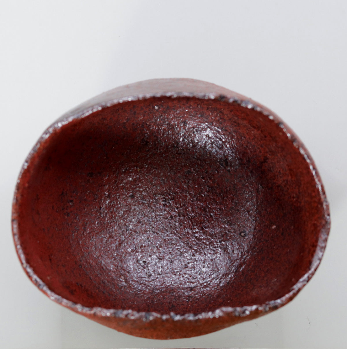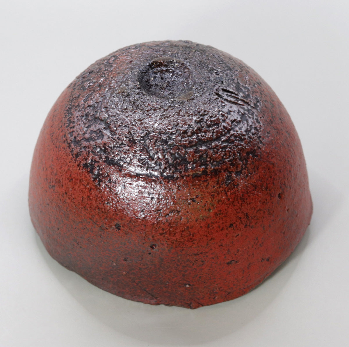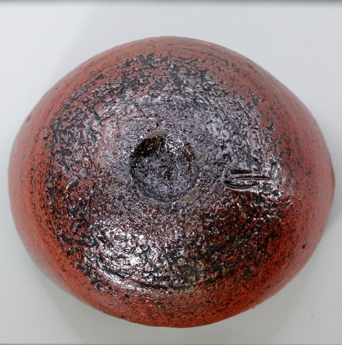 本作の外壁を覆う緋色は、鉄分を多量に含む丹波土を強還元で黒褐色に締めたのち、終盤で酸化に転じる二段階焼成で得られたものです。赤楽の艶やかさとは異なり、熾火が噛んだ痕跡を残すざらついた質感が際立ち、まるで冷え固まった溶岩の表面を思わせます。鉄粒が溶け切らずに点在することで黒褐色の細かな斑点が浮かび、緋色に奥行きを与えています。