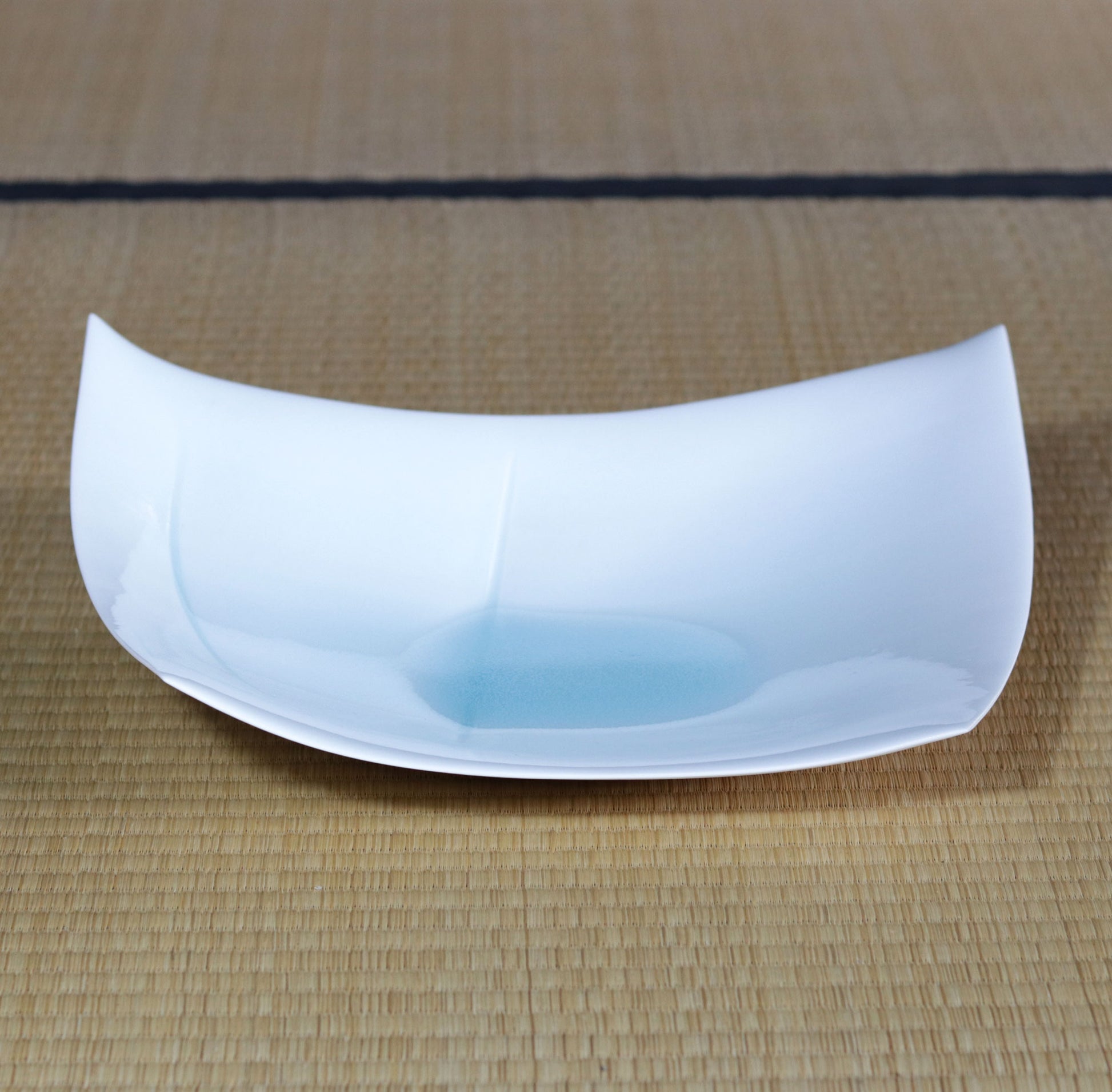 青白磁は、白磁の一種でありながら、釉薬に含まれる微量の鉄分によって発色する淡い青白色が特徴です。この特有の色合いは、白磁の透明感と釉薬の青緑色の美しいバランスによって生まれます。井倉幸太郎様の作品では、この伝統的な技法に現代的な造形が組み合わさり、まさに場の空気を変える美しさが放たれています。石舟器は、清楚で端正な形状と、青白磁の繊細な色彩が融合し、一つのアートとして完成しています。