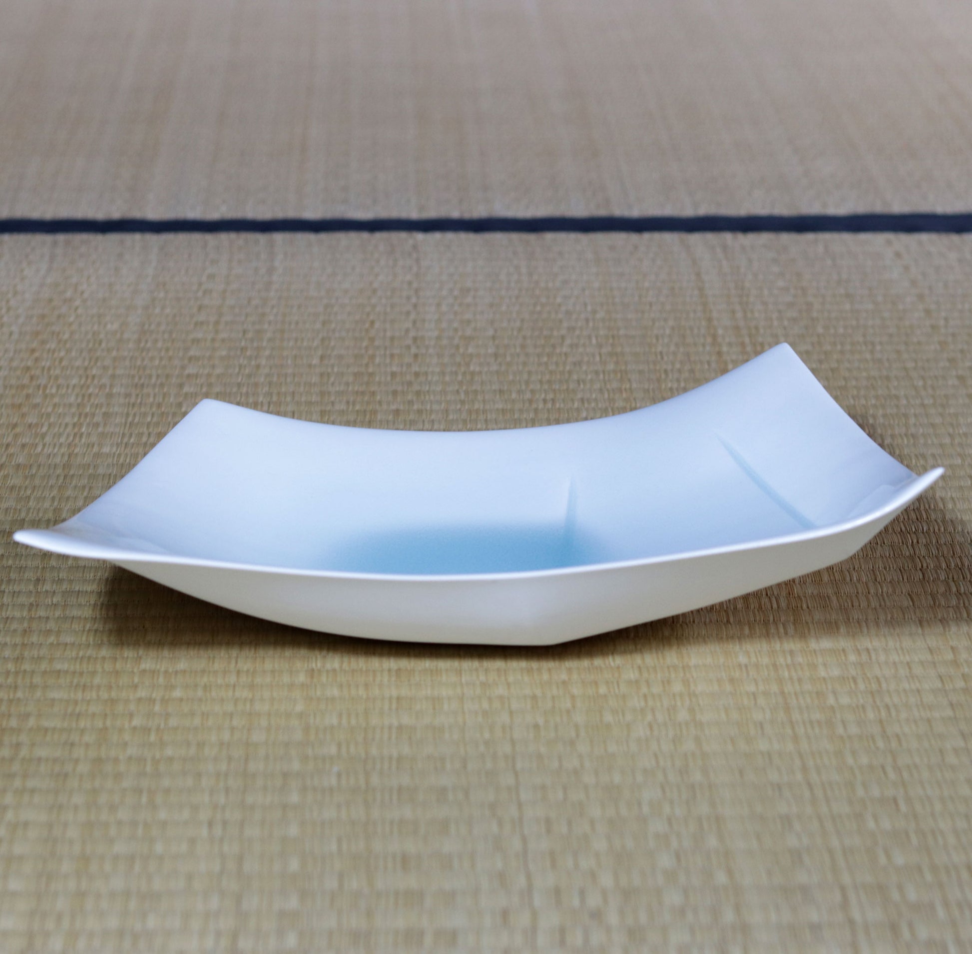 この「石舟器」では、青白磁特有の厚みのある釉薬が丁寧に施され、その上で鋭角的な舟の形状が、洗練されたモダンな美しさを際立たせます。青白磁の難しさとして、釉薬を厚く塗るため、焼成時に割れやすく器に負担がかかるという点がありますが、井倉幸太様はその難題を克服し、見事な作品を生み出しています。青白磁の透明感ある釉薬が、表面に水たまりのような美しい光を反射し、まるで自然の風景を閉じ込めたかのような印象を与えます。