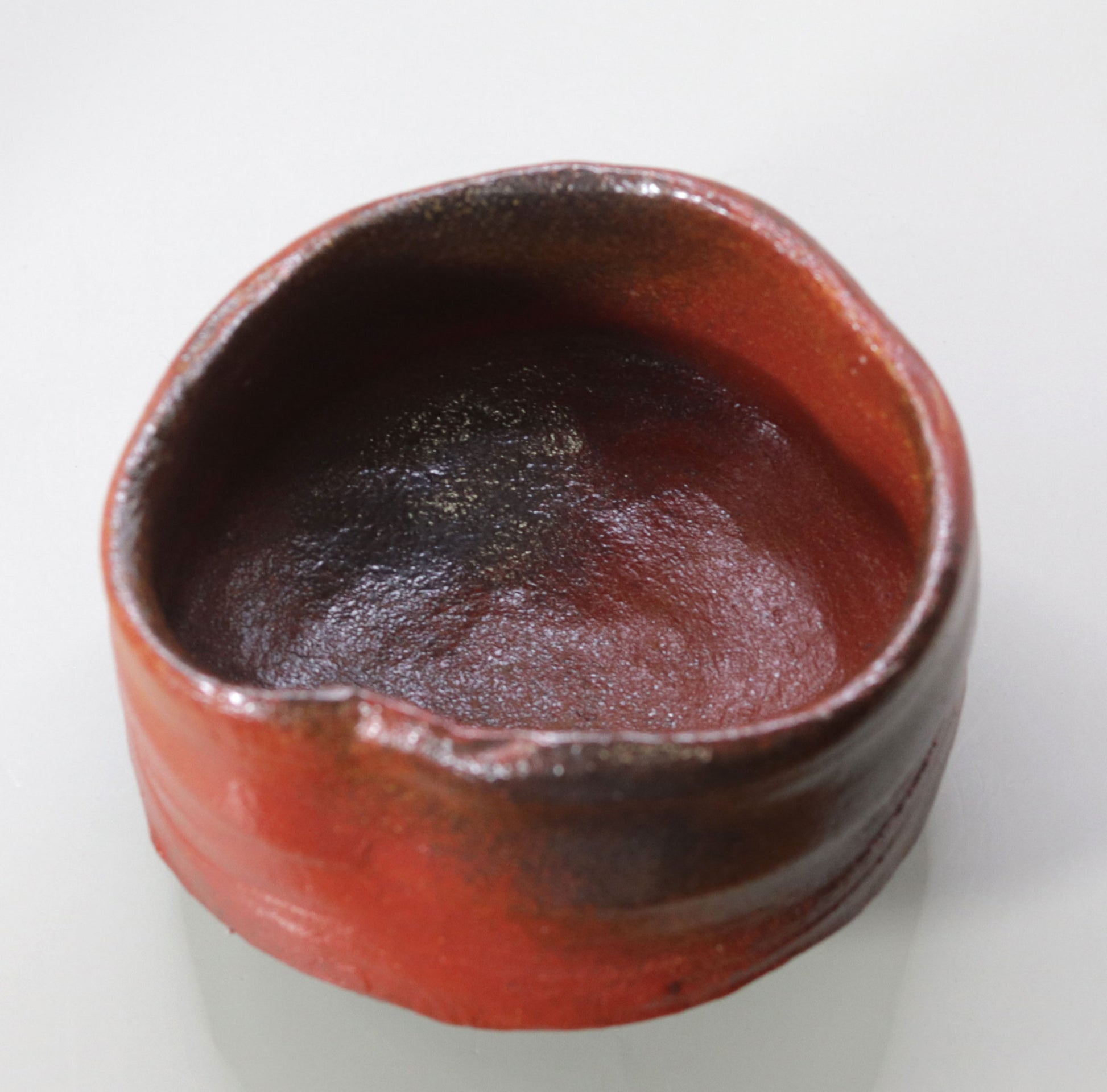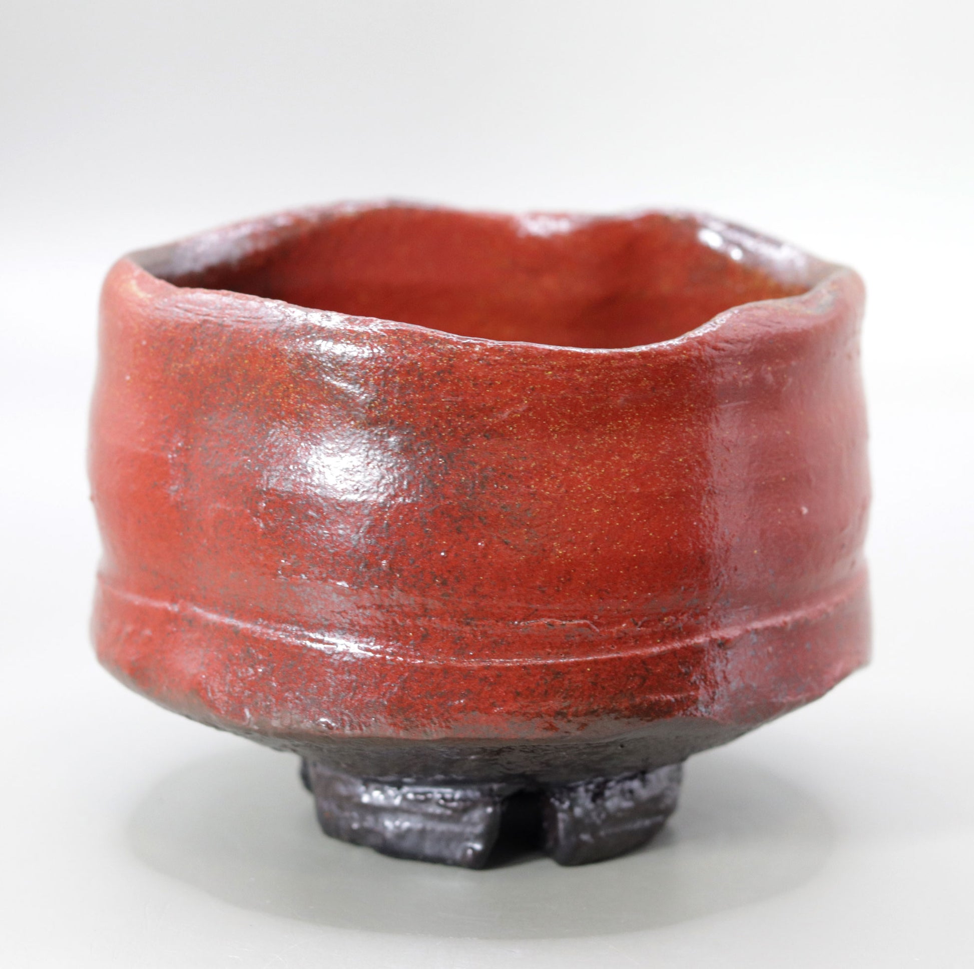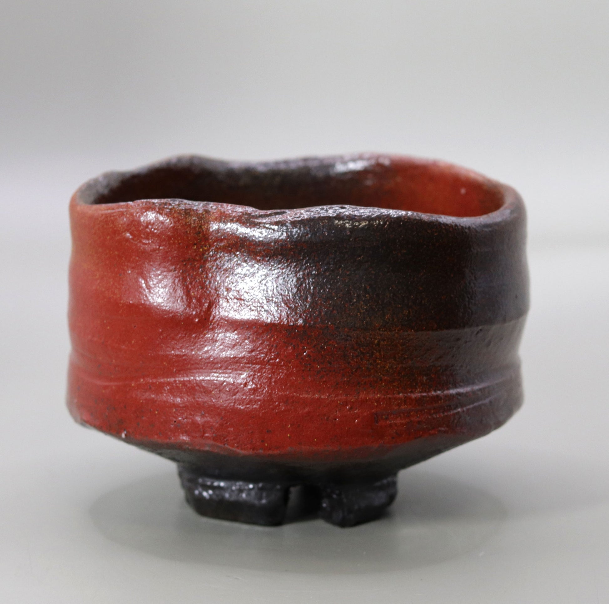 この茶碗は、見た目の迫力とは裏腹に、手に取った際の心地よさが際立っています。表面の滑らかな触感と手にしっかりと収まる形状が、所有者に「使う喜び」を与えます。手の中に収まるこの茶碗は、その豪快なデザインの中にも、緻密な計算が施されていることが感じられ、使うほどに愛着が湧く一品です。茶碗を持つことそのものが、ただの「使用」という行為を超え、作品と向き合う時間となり、茶の湯のひとときに特別な感動をもたらします。このような茶碗は、使い手との対話を深め、茶席を豊かにする要素となります。本作は、赤と黒の色彩が織り成す力強い対比と洗練された美しさが見事に融合した一品です。大胆で豪快な造形と割り高台の存在感が、茶碗全体に力強さと優雅さを与え、見る者、使う者に圧倒的なインパクトを与えます。この茶碗は、手に取るたびに新たな魅力を発見できる奥深さを持ち、日常の茶の湯においても特別な時間を提供します。その芸術性と実用性が絶妙に調和した「丹波赤茶盌」は、茶道具としての価値を超え、一つの芸術作品として、永遠に愛される傑作です。