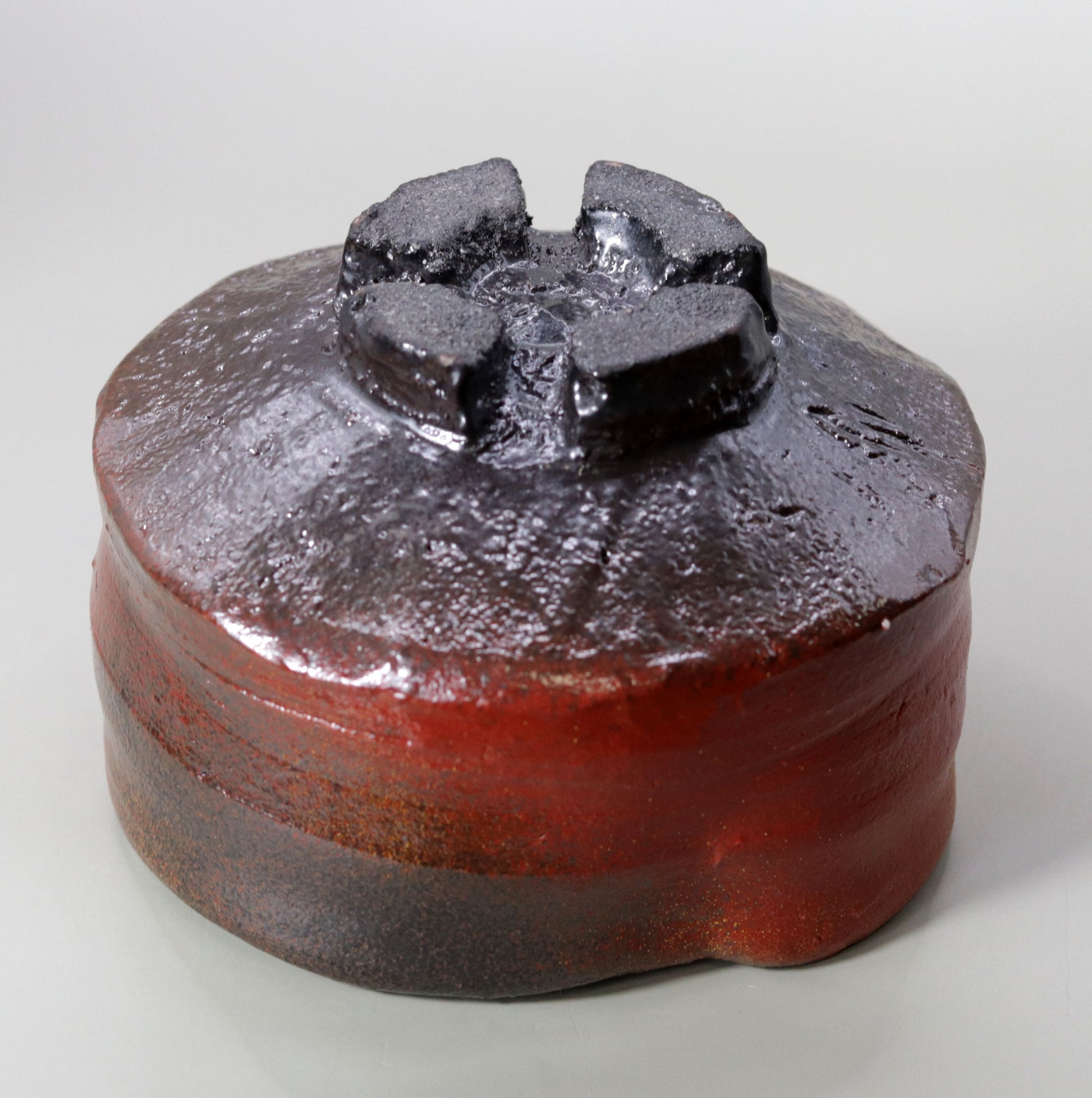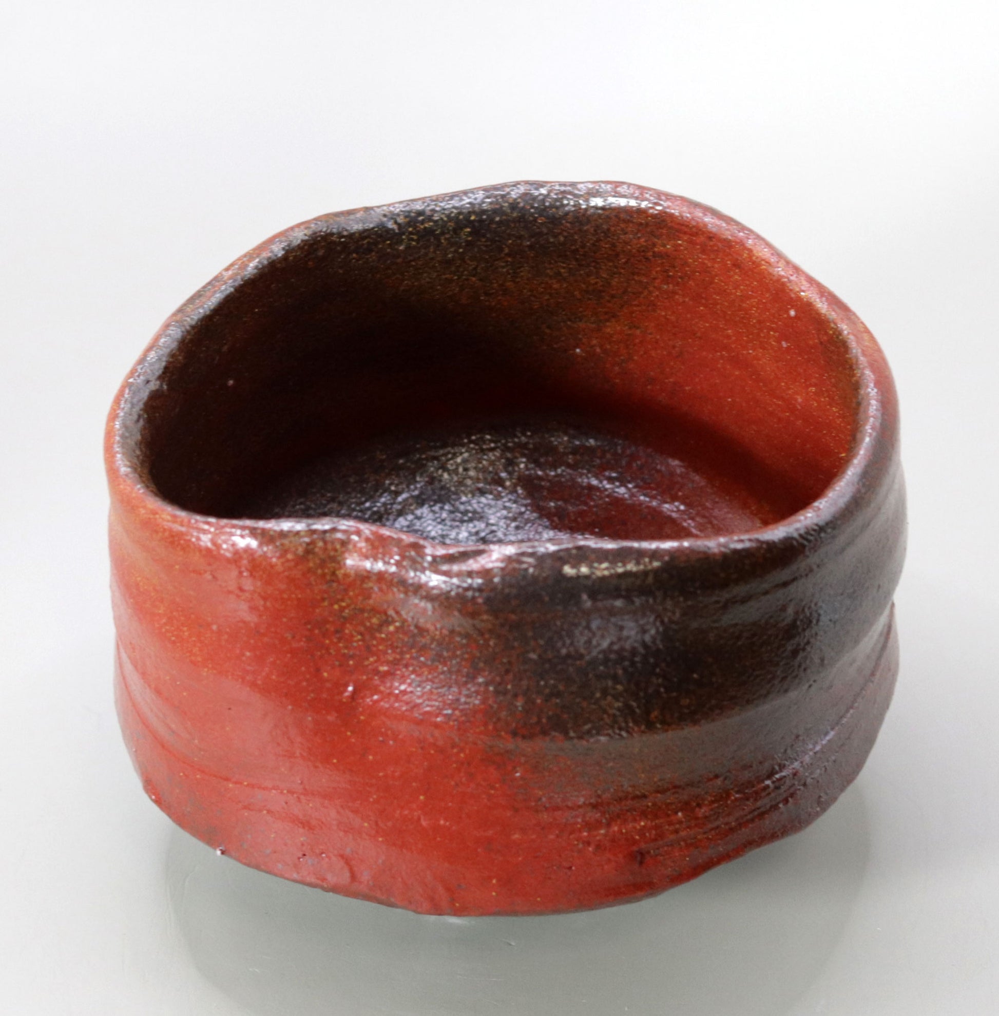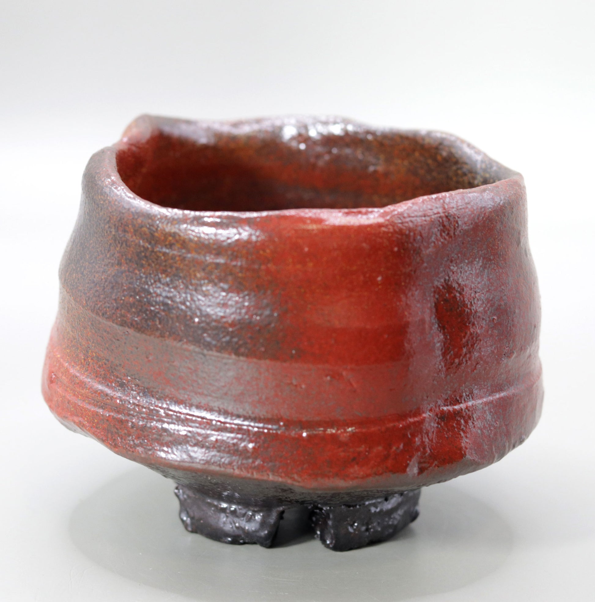 この茶碗は、見た目の迫力とは裏腹に、手に取った際の心地よさが際立っています。表面の滑らかな触感と手にしっかりと収まる形状が、所有者に「使う喜び」を与えます。手の中に収まるこの茶碗は、その豪快なデザインの中にも、緻密な計算が施されていることが感じられ、使うほどに愛着が湧く一品です。茶碗を持つことそのものが、ただの「使用」という行為を超え、作品と向き合う時間となり、茶の湯のひとときに特別な感動をもたらします。このような茶碗は、使い手との対話を深め、茶席を豊かにする要素となります。本作は、赤と黒の色彩が織り成す力強い対比と洗練された美しさが見事に融合した一品です。大胆で豪快な造形と割り高台の存在感が、茶碗全体に力強さと優雅さを与え、見る者、使う者に圧倒的なインパクトを与えます。この茶碗は、手に取るたびに新たな魅力を発見できる奥深さを持ち、日常の茶の湯においても特別な時間を提供します。その芸術性と実用性が絶妙に調和した「丹波赤茶盌」は、茶道具としての価値を超え、一つの芸術作品として、永遠に愛される傑作です。