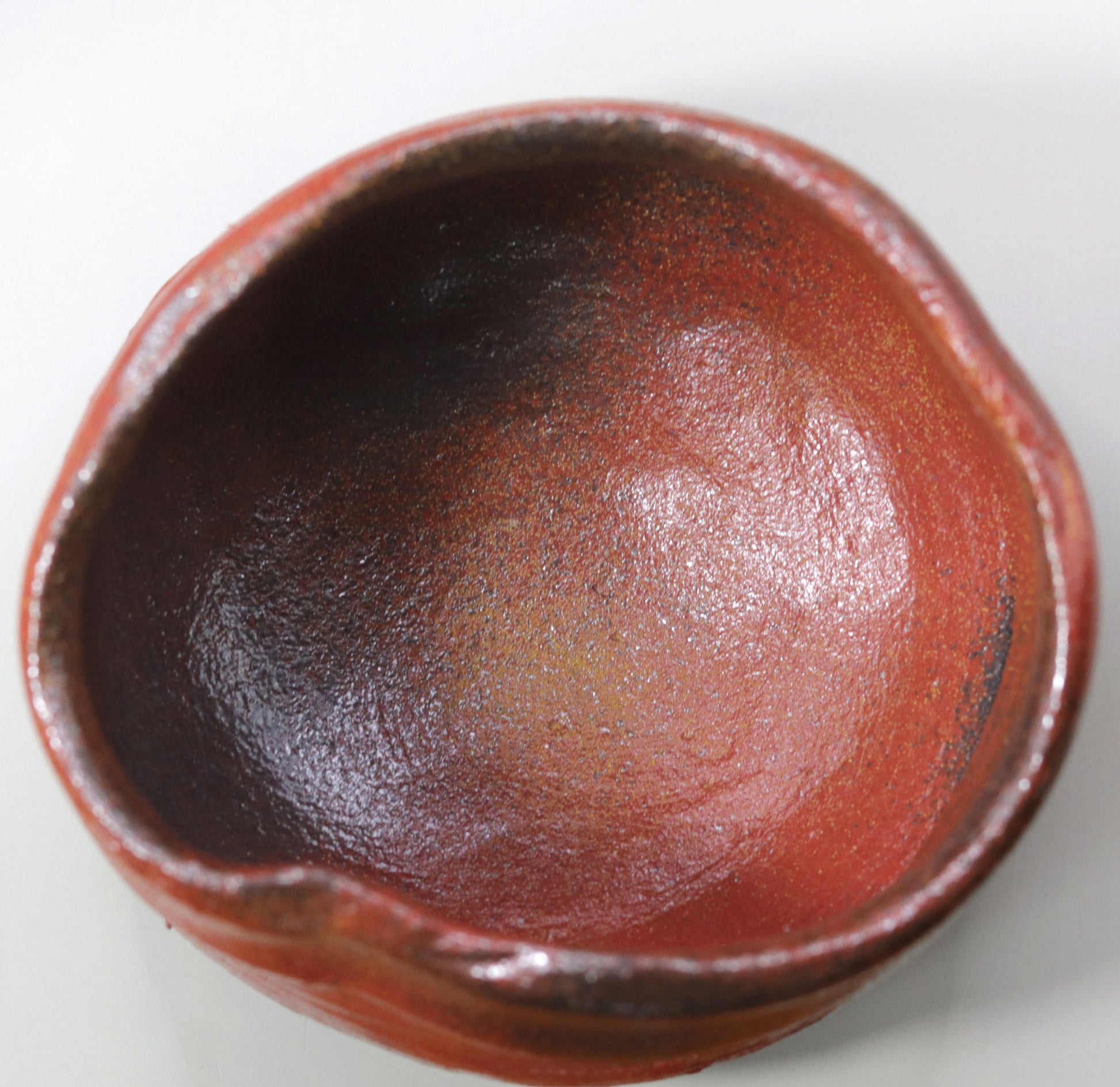 この茶碗の特徴の一つに、「割り高台」と呼ばれる特別な技法が用いられています。この高台の形状は、通常の茶碗とは異なり、大胆で力強い表情を持っています。割り高台が茶碗の下部を支えることで、全体にしっかりとした安定感を与えながらも、視覚的には軽やかさを保っています。また、茶碗全体に施された造形は、豪快さと繊細さが見事に融合しています。歪みのある形状が、人間の手作りの温かみを感じさせる一方で、その歪みが不自然ではなく、むしろ自然な美しさを醸し出しています。こうした大胆な造形は、西端正様が長年にわたる技術と感性を駆使して生み出した、まさに唯一無二の作品と言えるでしょう。