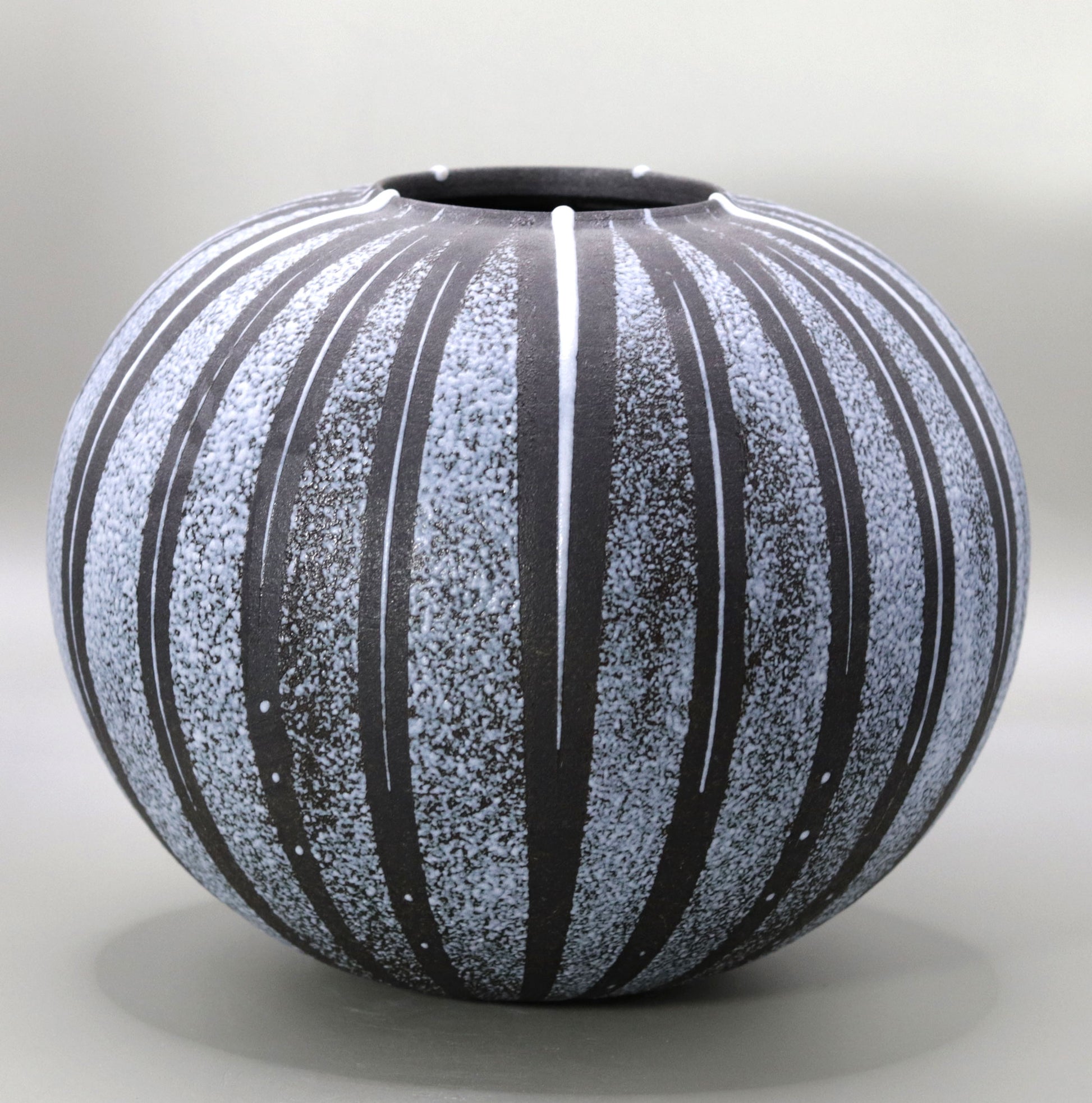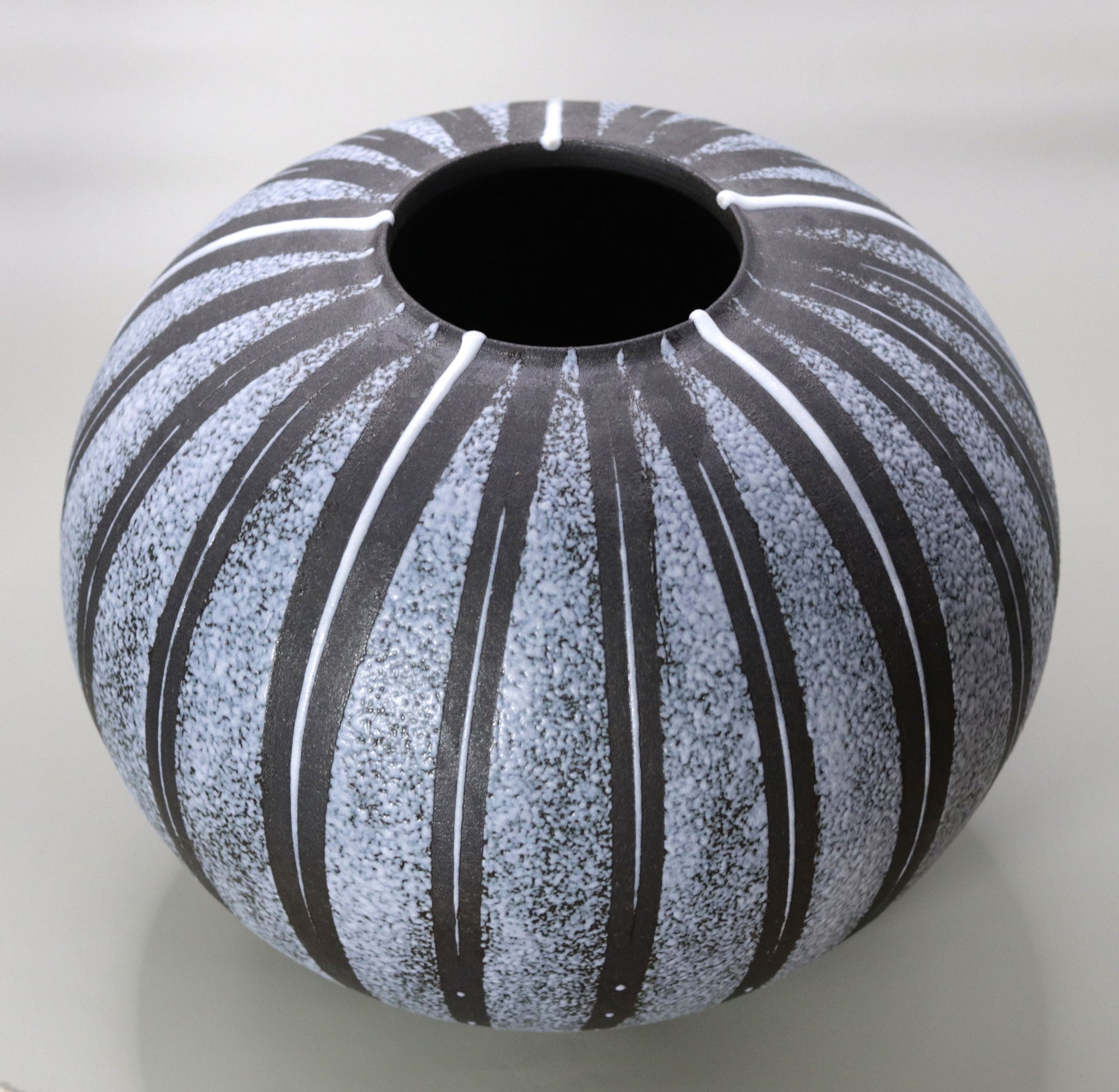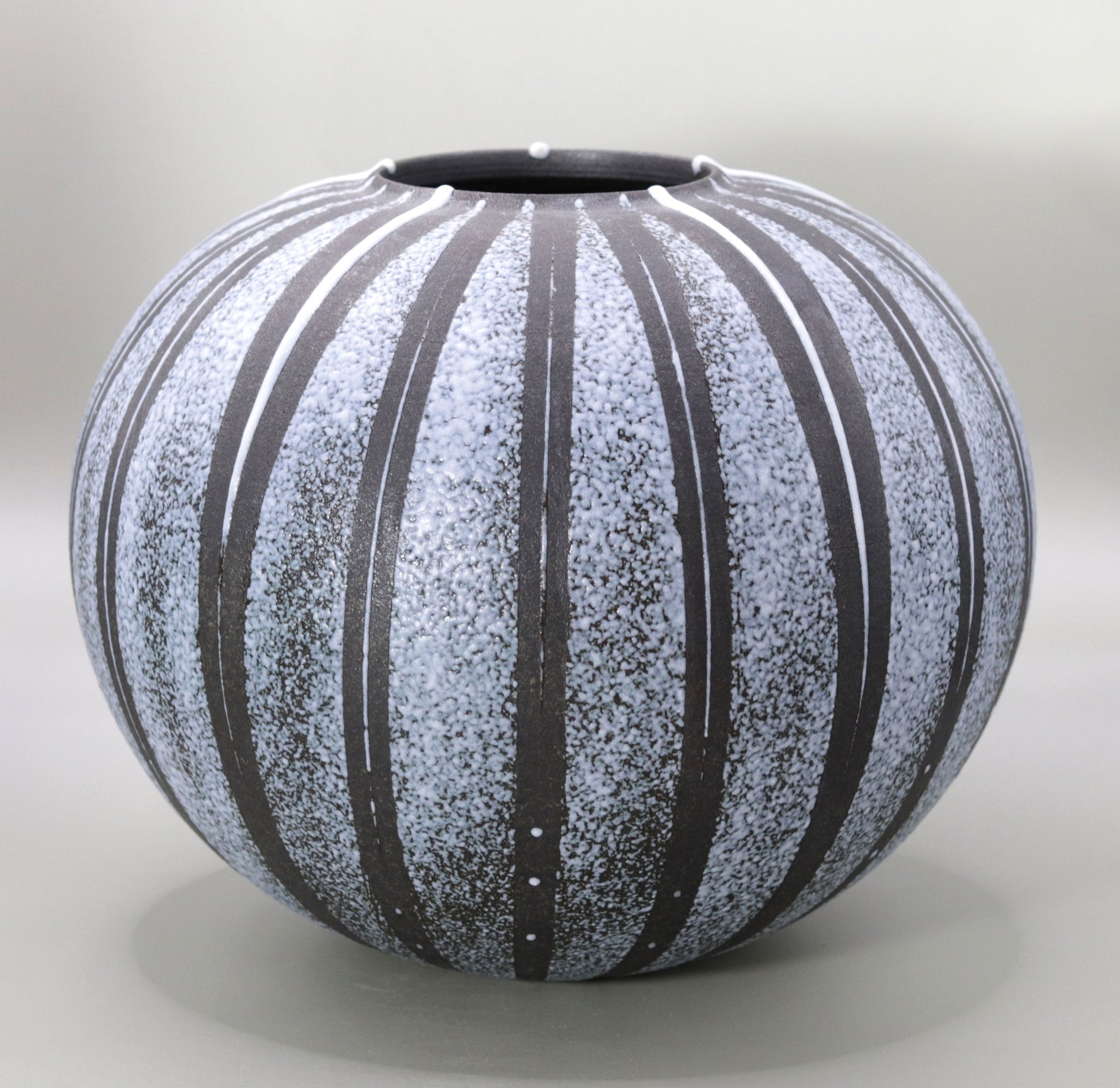 この作品に施された釉線文は、壺全体にリズムを与え、視覚的な動きを生み出しています。縦に伸びる線文は、吹き付けられた釉薬の色彩と相まって、作品に力強さと繊細さの二重の魅力を与えています。釉薬が規則的にかけられた線文を強調し、作品全体に立体感と存在感をもたらします。これにより技法が、伝統的な陶芸に現代的なアプローチを加える一方で、陶器の本来の魅力を最大限に引き出していることがわかります。