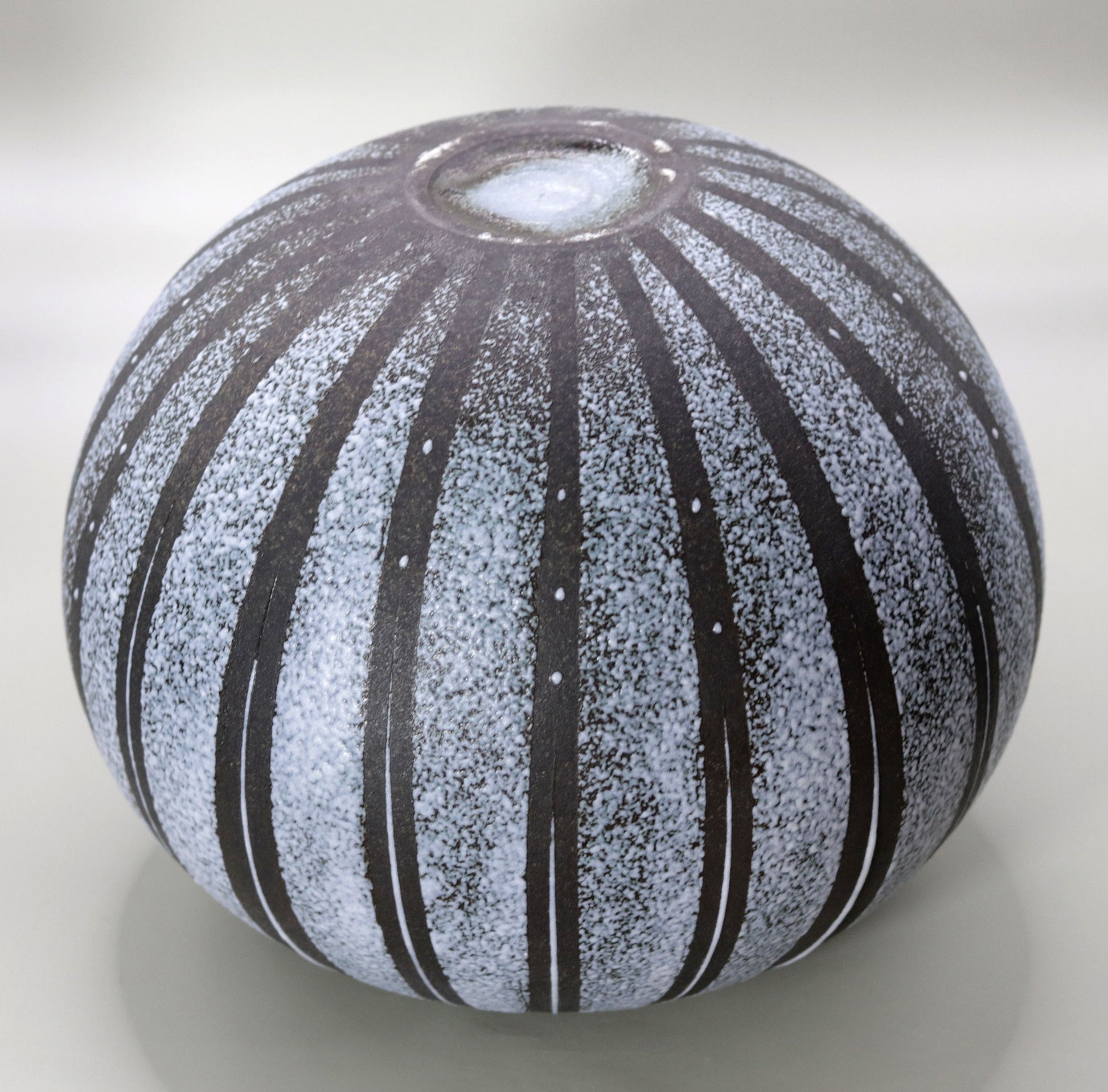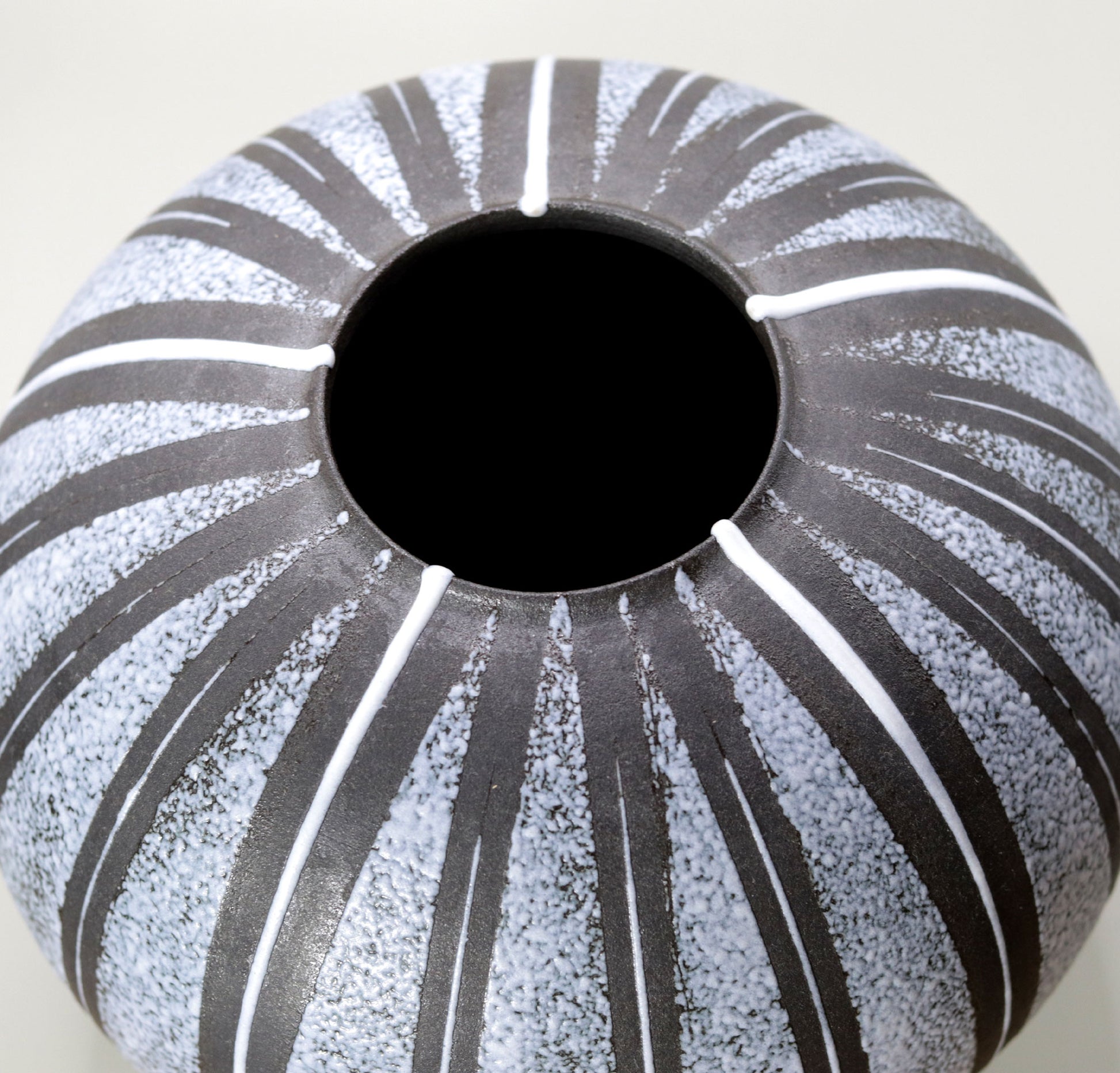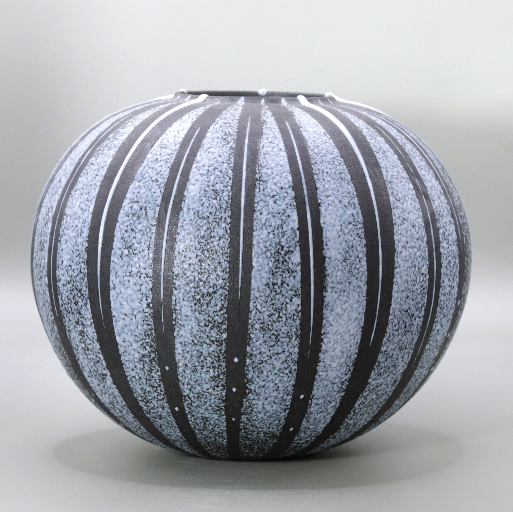 この作品に施された釉線文は、壺全体にリズムを与え、視覚的な動きを生み出しています。縦に伸びる線文は、吹き付けられた釉薬の色彩と相まって、作品に力強さと繊細さの二重の魅力を与えています。釉薬が規則的にかけられた線文を強調し、作品全体に立体感と存在感をもたらします。これにより技法が、伝統的な陶芸に現代的なアプローチを加える一方で、陶器の本来の魅力を最大限に引き出していることがわかります。