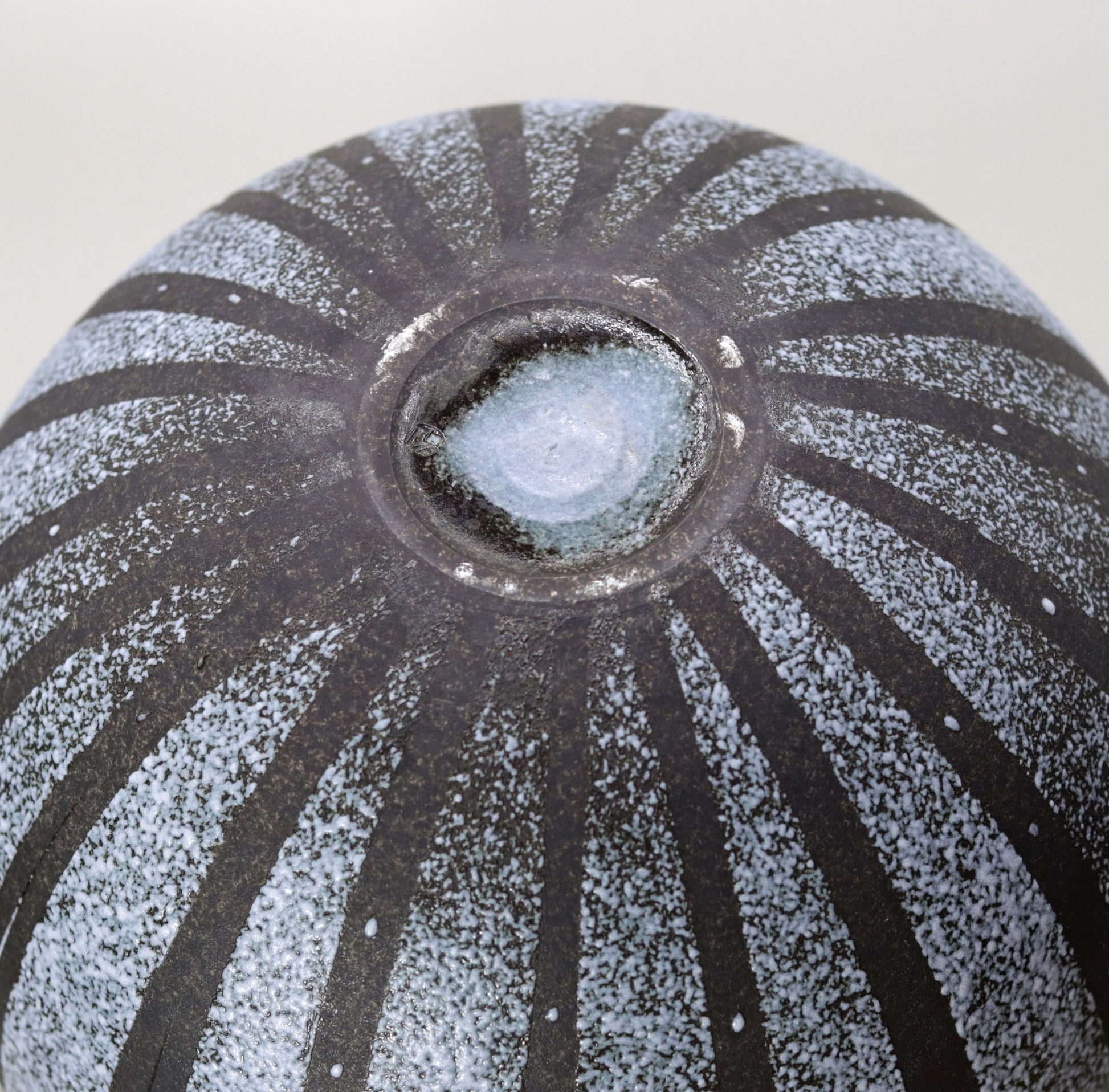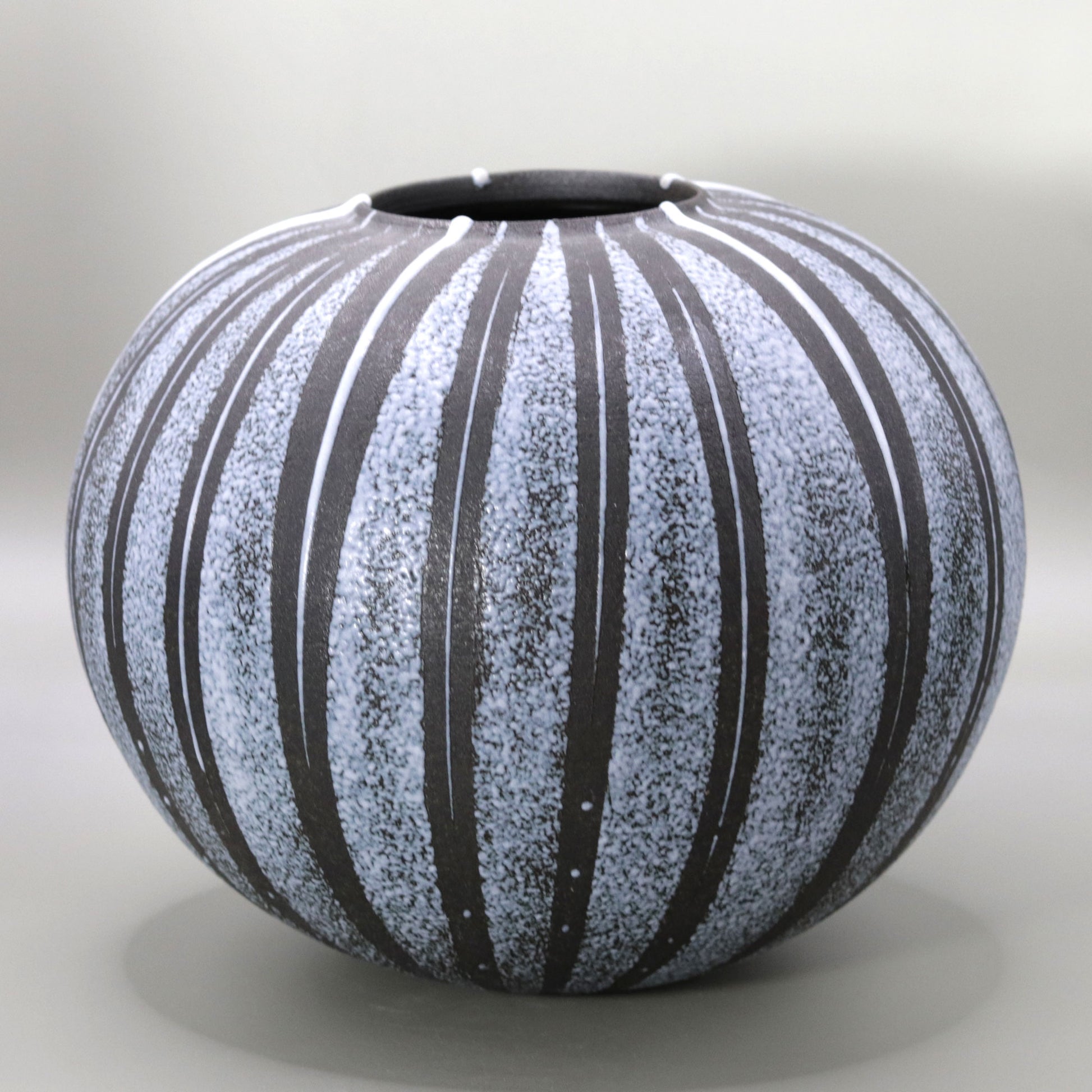 この壺の最も特徴的な部分は、規則的に施された縦の線文と釉薬の吹き付け技法です。釉薬が壺全体に吹き付けられることで、表面には美しい質感と独特の模様が生まれます。この釉線模様は、作品に動きを与えると同時に、陶器としての素材の魅力をさらに引き立てています。釉薬の層が施されたことで、壺に深みと鮮やかさが加わり、その力強さが際立ちます。